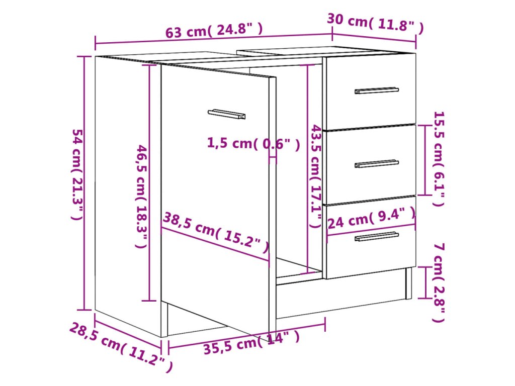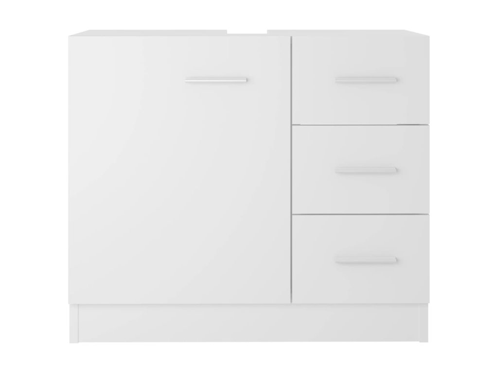 Skříňka je vyrobená z kompozitního dřeva, takže je pevná a stabilní. Obsahuje 1 přihrádku a 3 zásuvky, nabízí tedy celou řadu úložných možností a dodatečné místo, kam uklidit vaše koupelnové potřeby. Horní deska je zase ideálně uzpůsobená k umístění umyvadla. Skříňku snadno očistíte navlhčeným hadříkem.