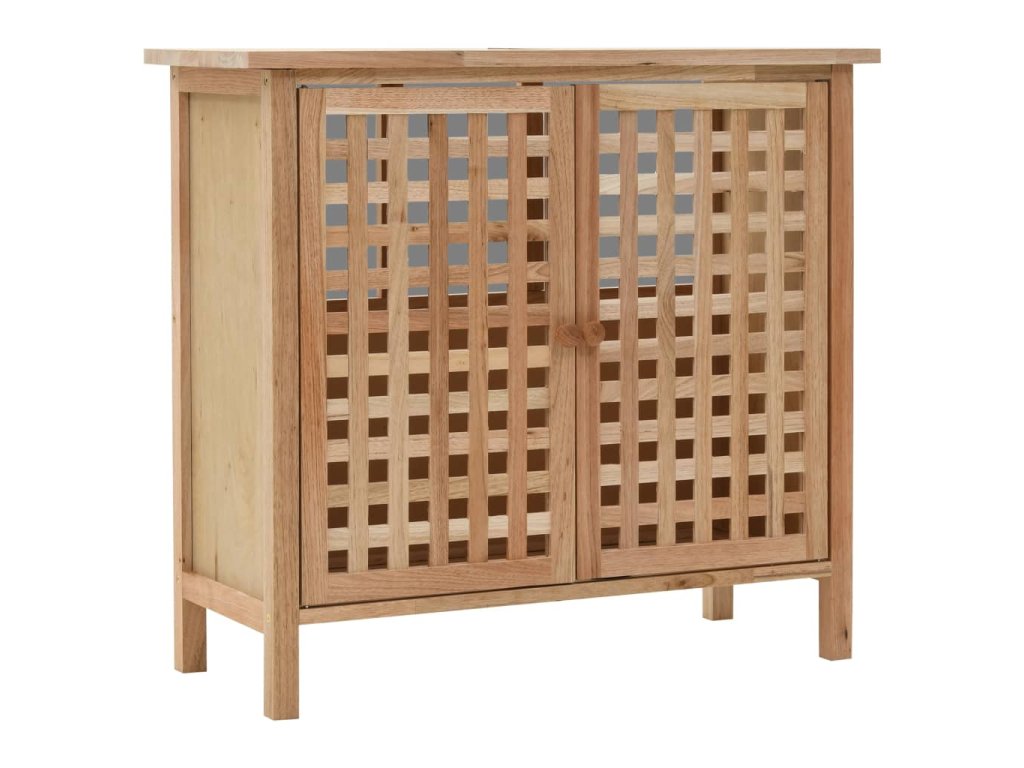 Tato skříňka pod umyvadlo se zrcadlem je vyrobena z masivního ořechového dřeva a překližky, takže je velmi robustní a odolná. Koupelnová skříňka má dvě dvířka s mřížkovým designem, což umožňuje dobré větrání předmětů uvnitř. Velký prostor a police uvnitř skříňky poskytují dostatek místa pro ukládání věcí, jako jsou ručníky a hygienické výrobky. Zrcadlo má pevnou roštovou poličku pro umístění menších předmětů, jako jsou zubní kartáčky, kosmetika atd.