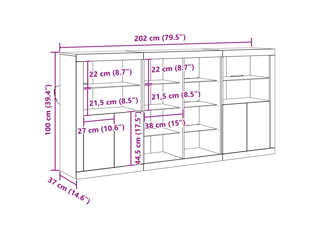 Tahle stylová skříň na servírování s integrovanými LED světly nabízí super úložný prostor jak pro jídelny, tak pro obýváky. S jejím rustikálním šarmem, tento obdélníkový kousek nabízí hodně místa a přidává moderní nádech, který se hodí k různým stylům dekorací. Je vyrobená z inženýrské dřevotřísky, aby dlouho vydržela, a její štíhlý design vytváří teplou a vítající atmosféru, ideální pro setkání nebo pohodový večer.