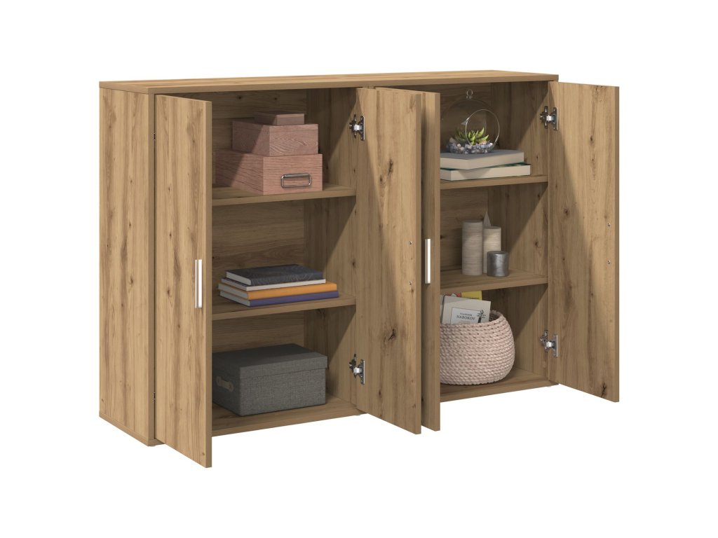 Tahle moderní komoda je ukázkou kombinace funkčnosti a elegantního designu. Je vytvořena pro ty, kdo mají rádi jednoduchost a styl. Dělá jídelnu a obývák atraktivnější svým sofistikovaným obdélníkovým tvarem a čistými liniemi. Mimo to nabízí dost místa k uskladnění a výborně spojuje moderní styl a praktické využití, což ji činí ideální do všestranných obytných prostorů.