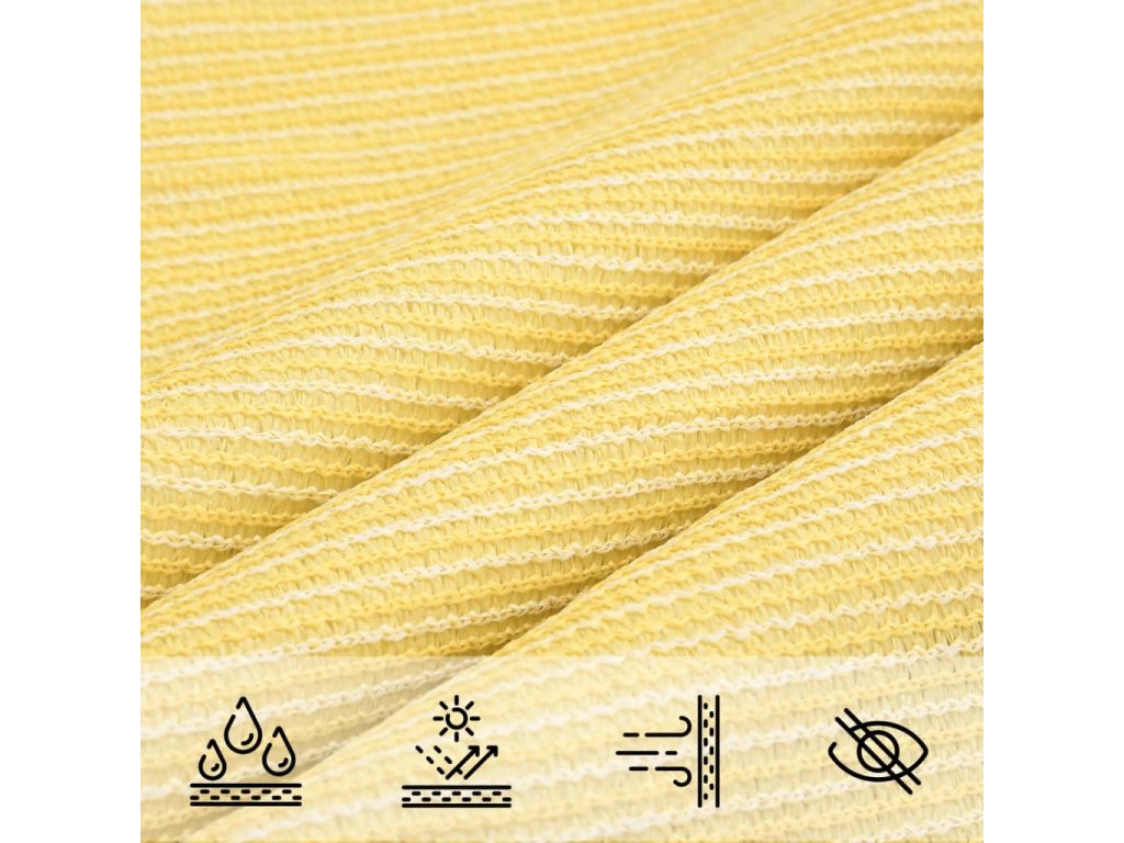 Sluneční plachta vyrobená ze 100% HDPE (vysokohustotní polyethylen) vás chrání před přímým slunečním zářením, umožňuje dostatečný průchod vzduchu a je propustná pro vodu. HDPE je speciálně upraven, takže je odolný proti plísním a UV záření. Slunečník se snadno sestavuje pomocí nerezových upevňovacích prvků na každém rohu a přiložených lanek.