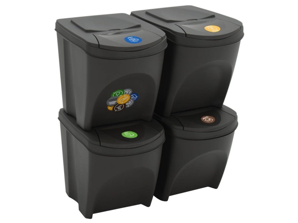 - Obsahuje štítky na třídění odpadu pro každý koš (sklo, papír, plast, organické látky, jiné)