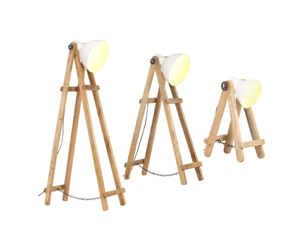 Tyto lampy s vintage designem v interiéru zaujmou na první pohled. Železné stínidlo s bílou povrchovou úpravou šíří teplé a příjemné světlo. Rám z masivního mangovníkového dřeva s povrchovou úpravou ve starovenkovské hnědé barvě se perfektně hodí do rustikálního nebo industriálního interiéru. Lampy v této sadě mají 3 odlišné velikosti pro různé specifické potřeby osvětlení. Ve stínidle je objímka E27 pro žárovku o maximálním výkonu 25 W. Můžete si vybrat a nainstalovat žárovku E27 jakékoli barvy, abyste vytvořili atmosféru relaxace a odpočinku podle vašich představ. Lampa se snadno zapíná a vypíná dodaným podlahovým spínačem.