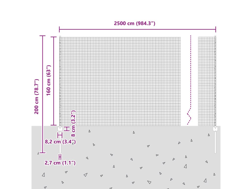 - Celkové rozměry: 2500 x 2,7 x 160 cm (D x Š x V)