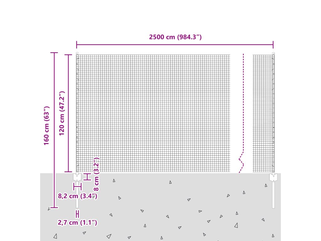 - Celkové rozměry: 2500 x 2,7 x 120 cm (D x Š x V)