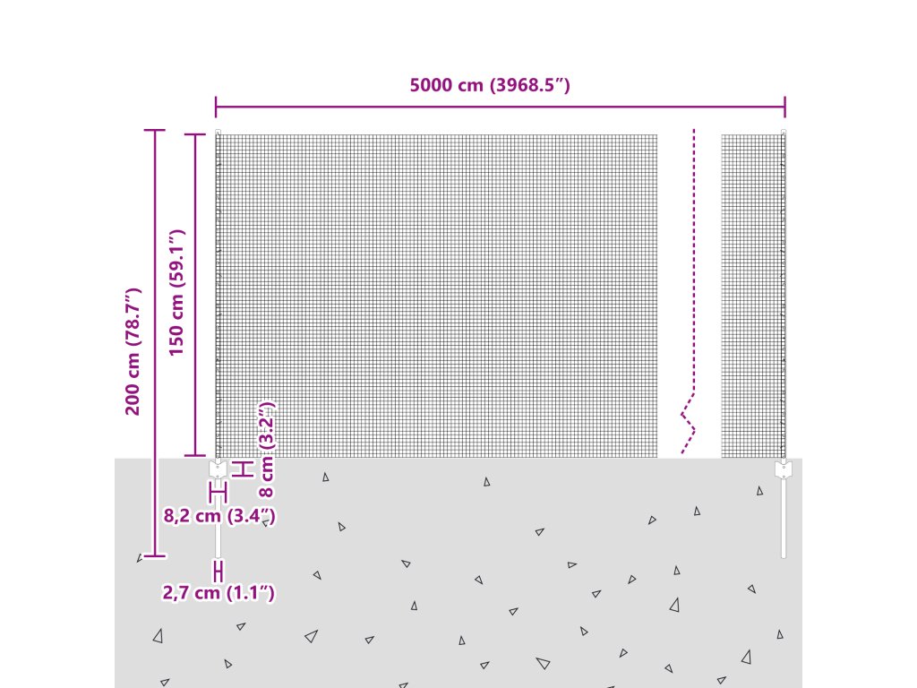 - Celkové rozměry: 5000 x 2,7 x 150 cm (D x Š x V)