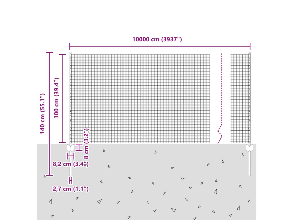 - Celkové rozměry: 10000 x 2,7 x 100 cm (D x Š x V)