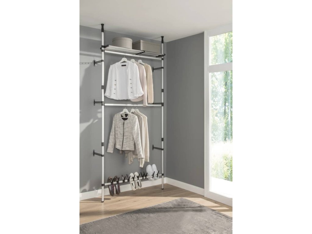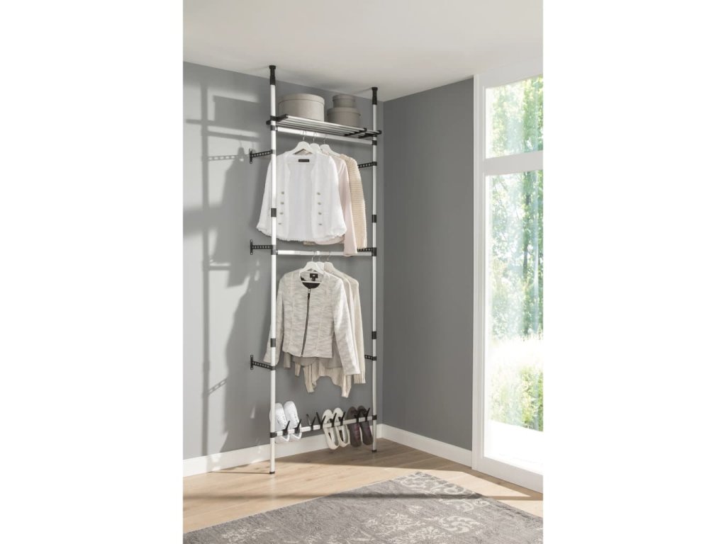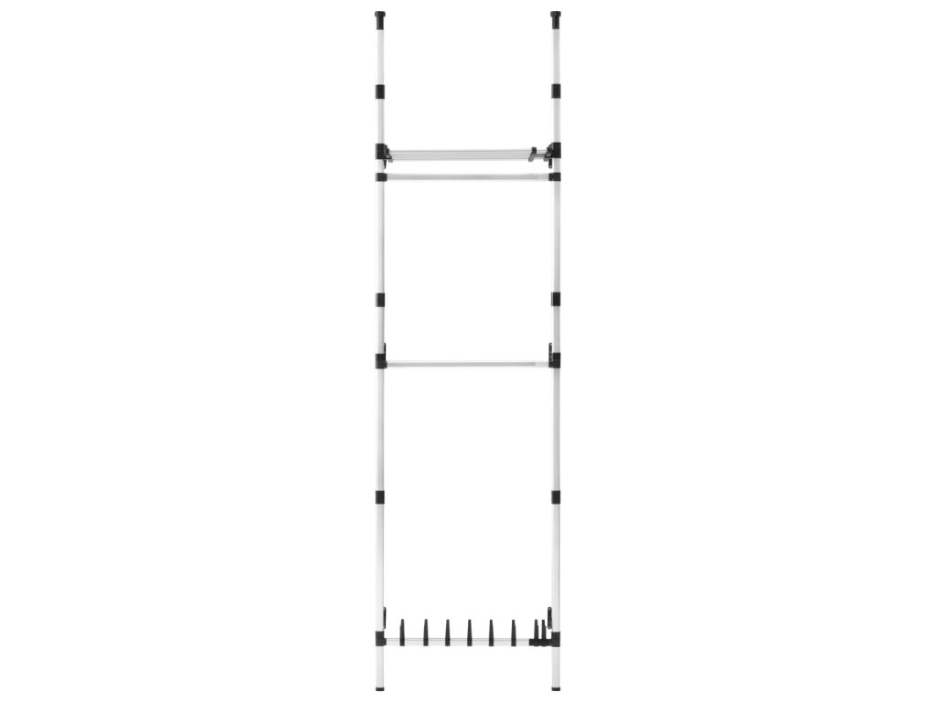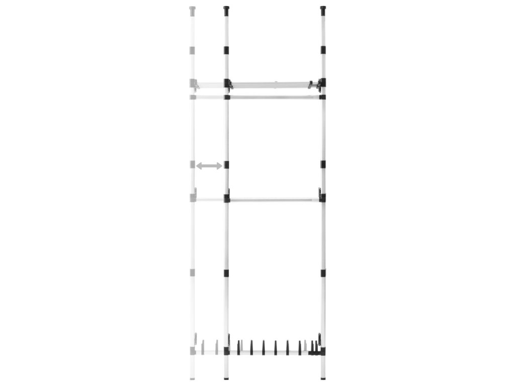 Teleskopický šatní systém je vyrobený z hliníku, takže je odolný a robustní. Tento úložný regál s teleskopickým systémem lze nastavit a přizpůsobit jeho výšku a šířku danému prostoru a vašim požadavkům. Nabízí jedinečný a důmyslný způsob uspořádání šatníku.