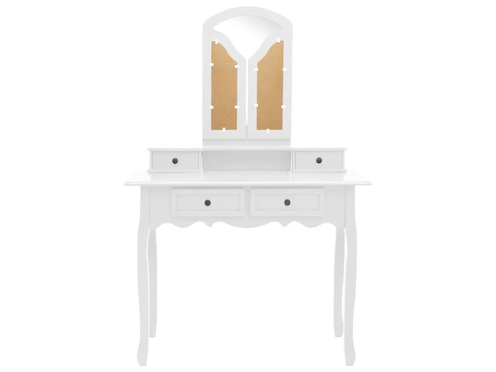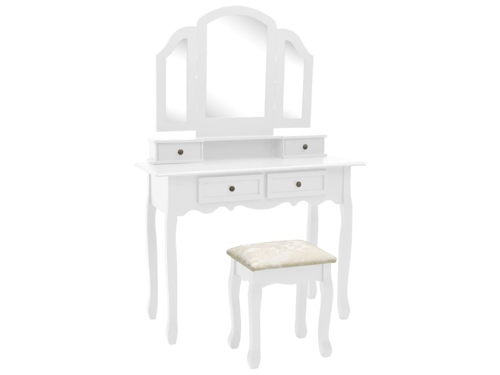 Toaletní stolek je opatřený zrcadlem 3 v 1. Po stranách hlavního zrcadla jsou umístěná dvě zrcadla, která jsou připevněná k hlavnímu zrcadlu odolnými panty. Proto je můžete natočit do požadovaného úhlu. Určitě vás mile překvapí, že zrcadlo a stolek můžete používat odděleně. Ve stolku jsou 4 chic zásuvky, které slouží jako další úložný prostor na vaše šperky, kosmetiku nebo vaše osobní věci. Ať už se rozhodnete umístit tento kosmetický stolek se stoličkou kamkoliv, jistě se stane středem pozornosti.