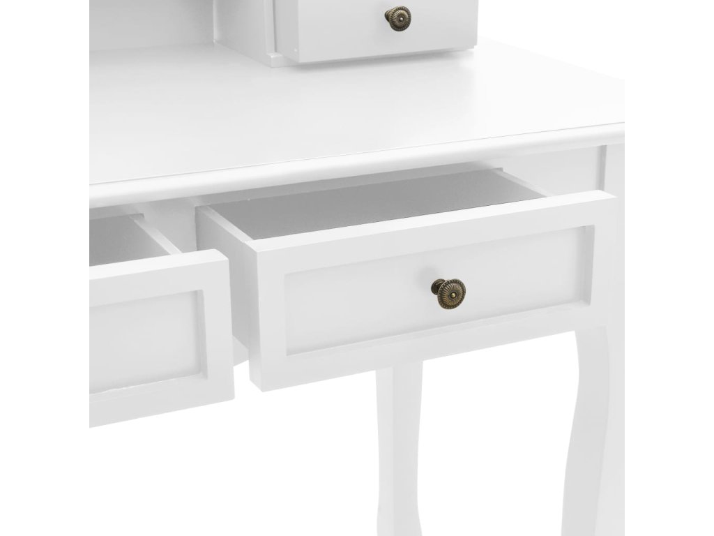 Tento okouzlující toaletní stolek se stoličkou je vyrobený z vysoce kvalitního pavlovniového dřeva. Jeho viktoriánský styl a čistě bílá povrchová úprava vnesou do vašeho budoáru či šatny eleganci a krásu. Exkluzivní řemeslné zpracování je dalším z charakteristických znaků tohoto setu se stolkem a stoličkou.