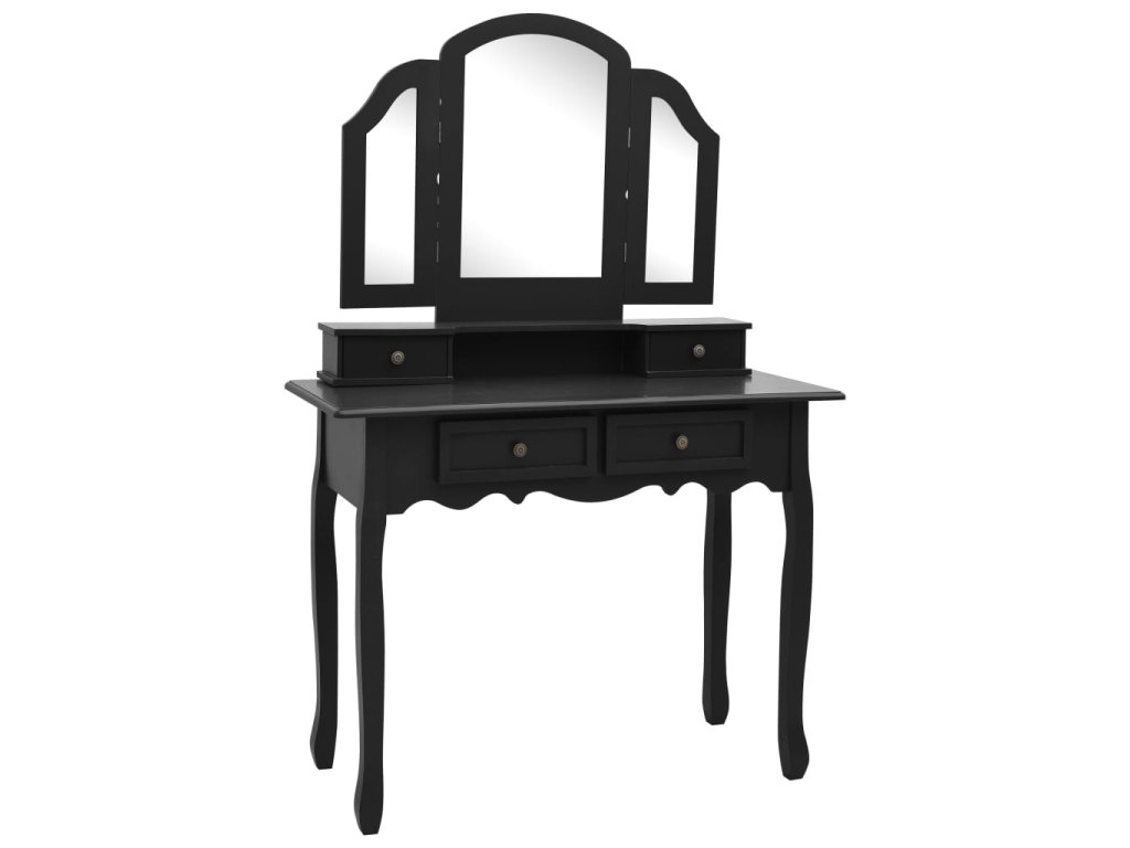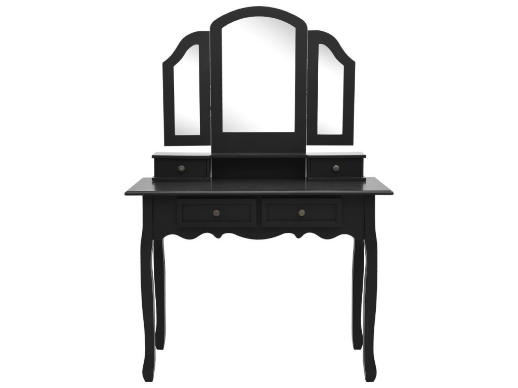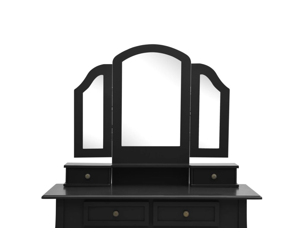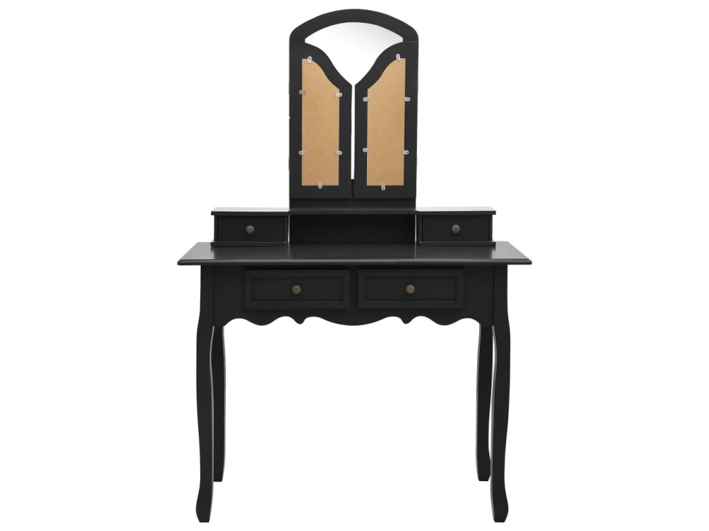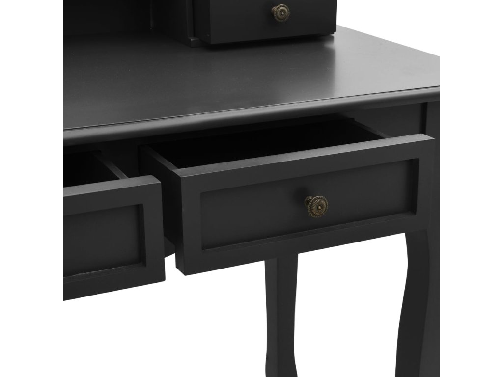 Tento okouzlující toaletní stolek se stoličkou je vyrobený z vysoce kvalitního pavlovniového dřeva. Jeho viktoriánský styl a čistá černá povrchová úprava vnesou do vašeho budoáru či šatny eleganci a krásu. Exkluzivní řemeslné zpracování je dalším z charakteristických znaků tohoto setu se stolkem a stoličkou.