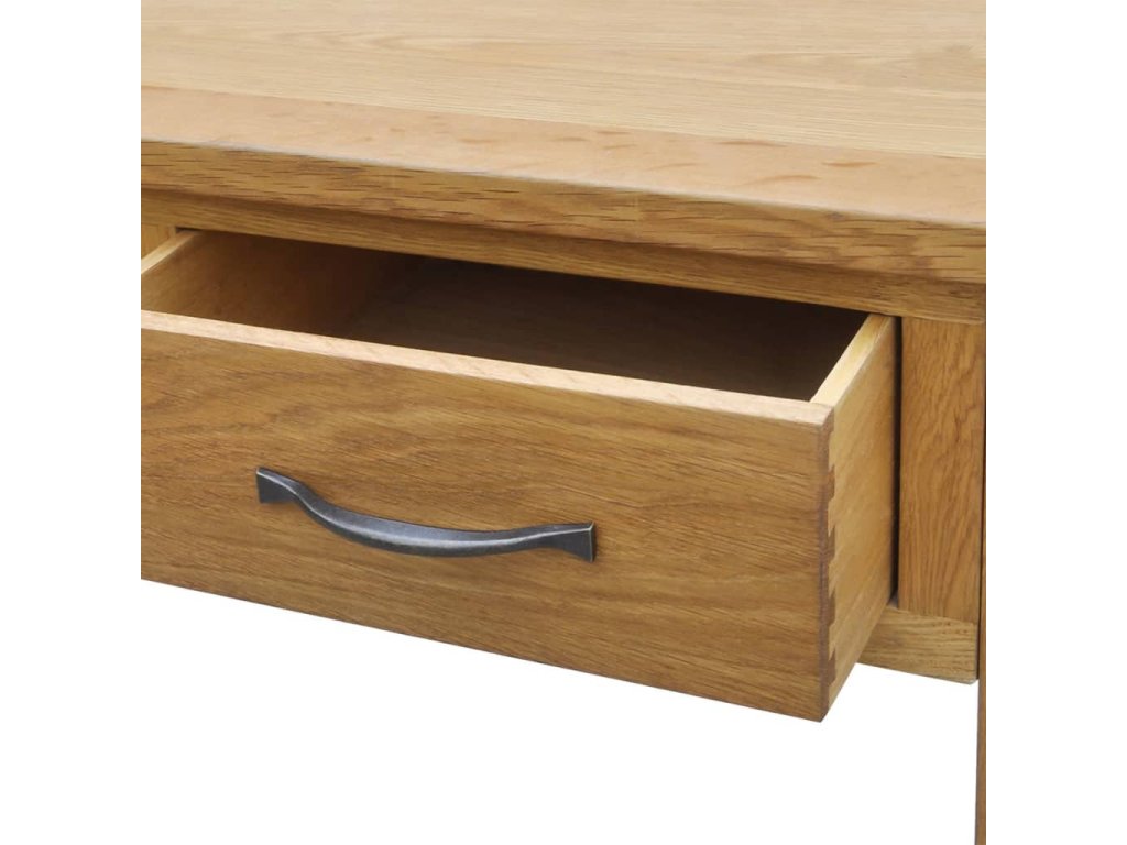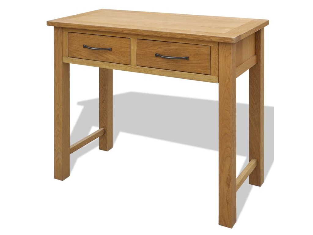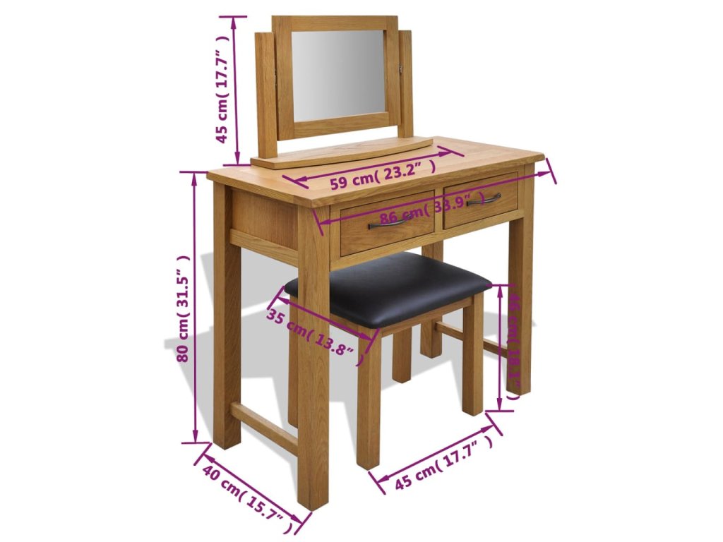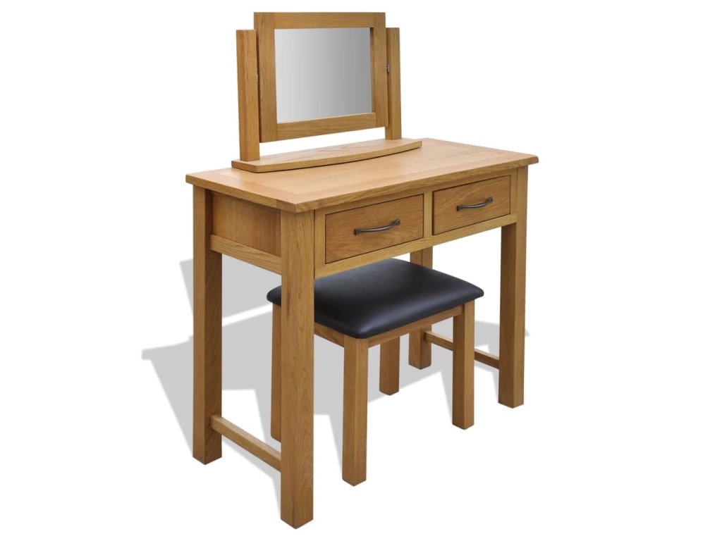 Tento dřevěný toaletní stolek představuje skvělý poměr kvality a ceny! Stolek v přírodním dubovém odstínu je vyrobený z vysoce kvalitního dubového dřeva a jiných tvrdých dřev. Tento krásný set je doplněný sladěnou stoličkou, čalouněnou umělou kůží, a stylovým zrcadlem. Zaoblené hrany dodávají designu každého kusu rustikální půvab.