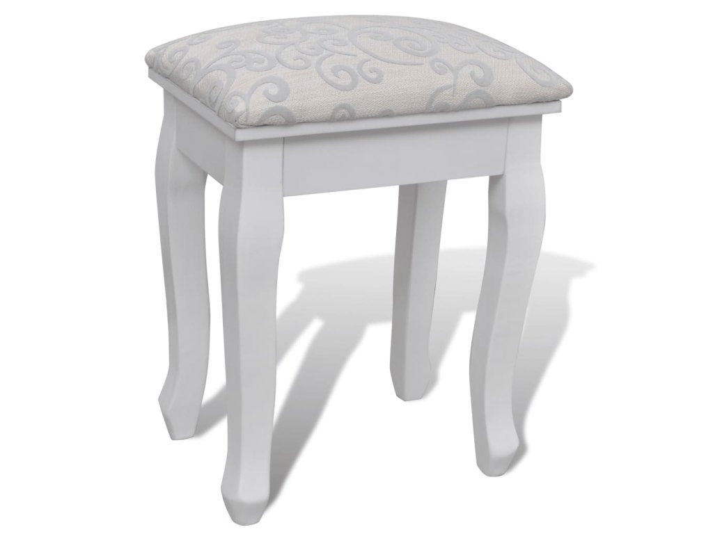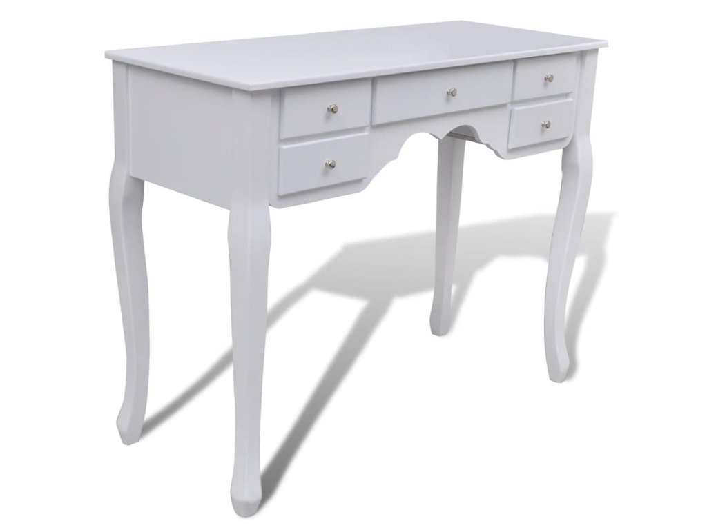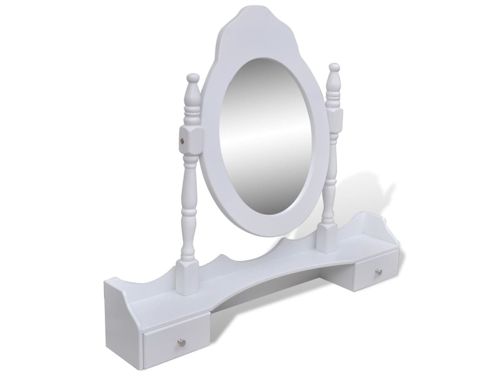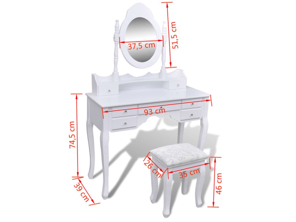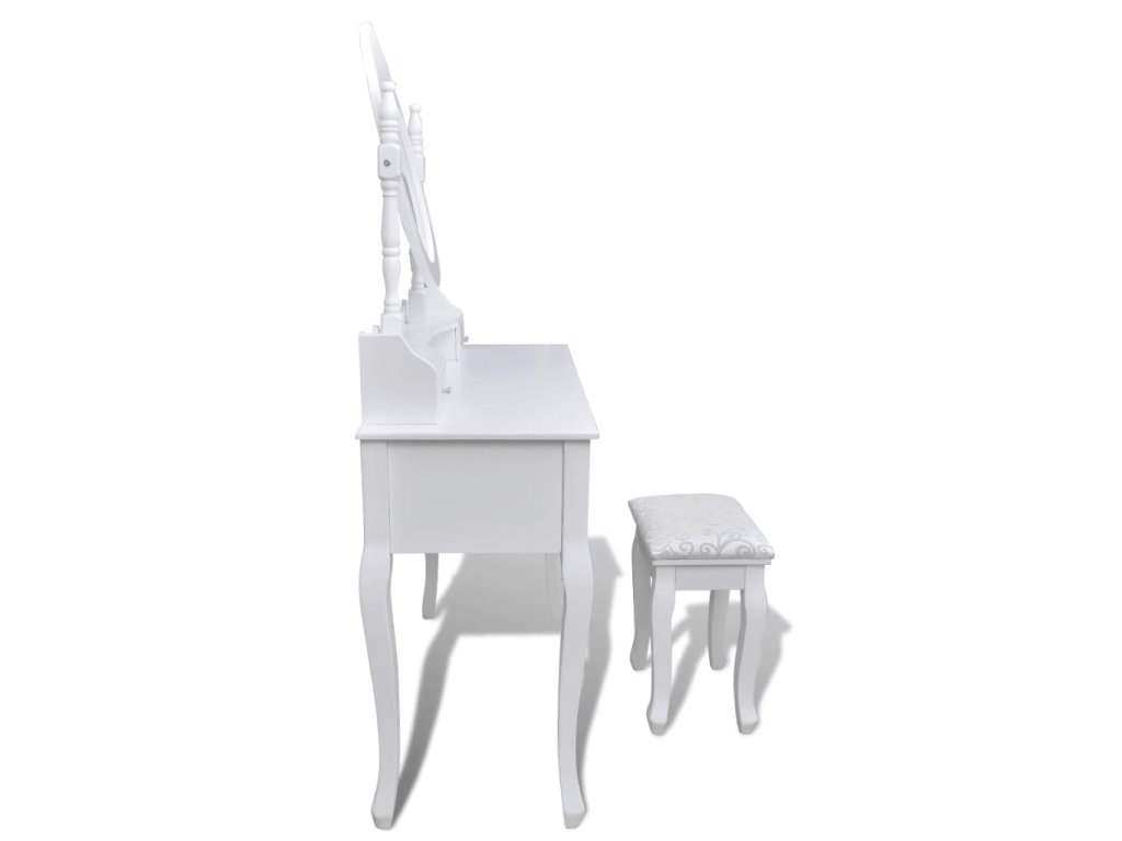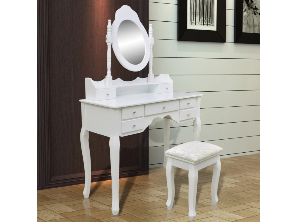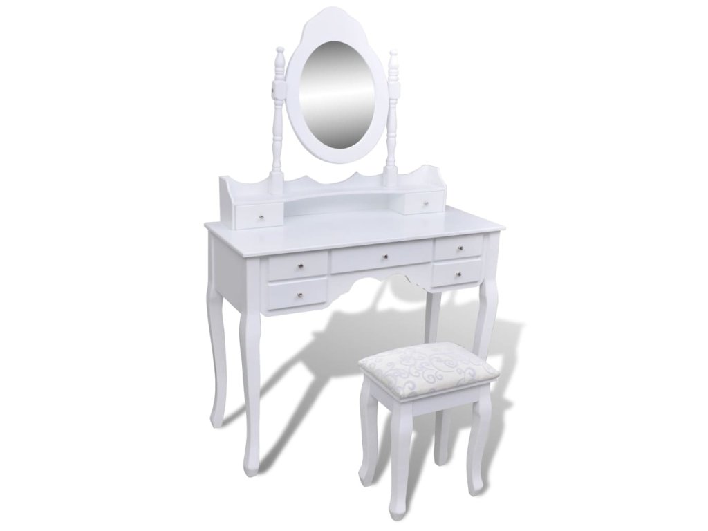Zrcadlo stolku má volně stojící rám, takže ho budete moci natočit do požadovaného úhlu. Překvapí vás, že zrcadlo a stolek můžete používat samostatně. Sedm elegantních zásuvek vám poskytne místo navíc na vaše ozdoby, kosmetiku a další soukromé věci. Tento toaletní stolek se stoličkou bude vynikat kdekoliv, kam ho umístíte.