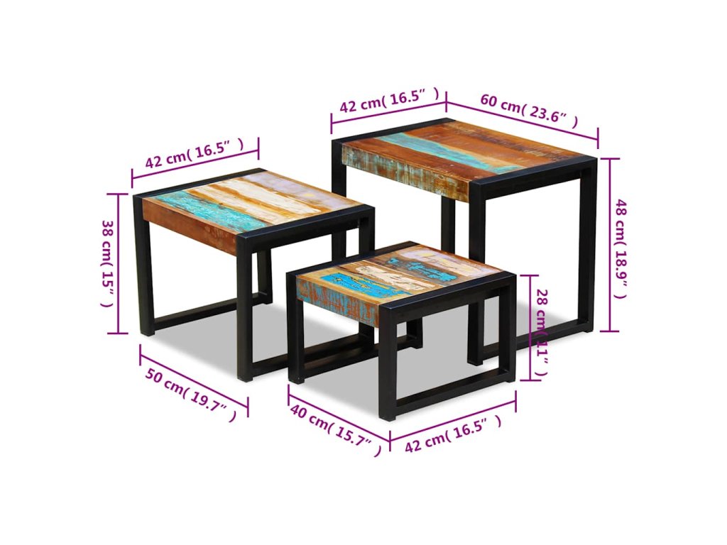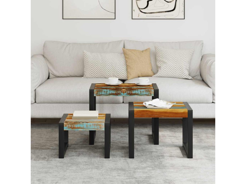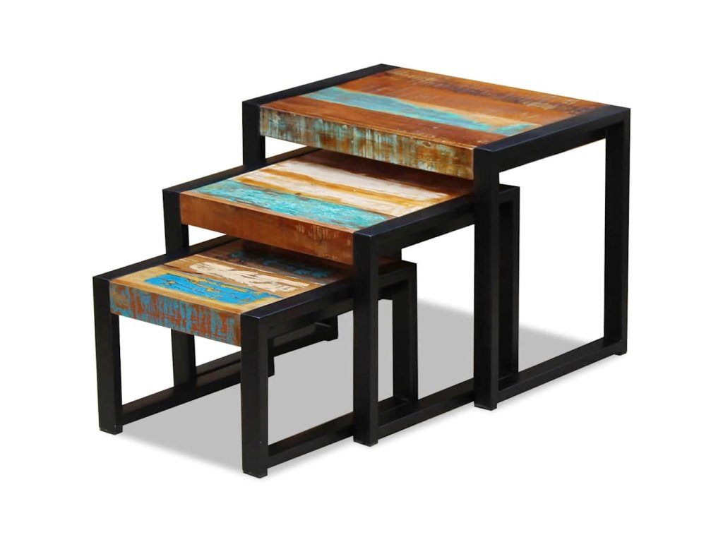 Tato vintage sada 3 stohovatelných stolků, vyrobených z masivního recyklovaného dřeva, bude nadčasovým doplňkem do vaší domácnosti. Dřevěné stolky se dají používat jako konferenční stolky, stolky ke gauči, stolky do obývacího pokoje, odkládací stolky, noční stolky, telefonní stolky apod. Díky svým pevným ocelovým rámům jsou tyto stolky velmi stabilní a odolné. Protože jsou stohovatelné, ušetří vám spoustu místa, když je zrovna nebudete používat.