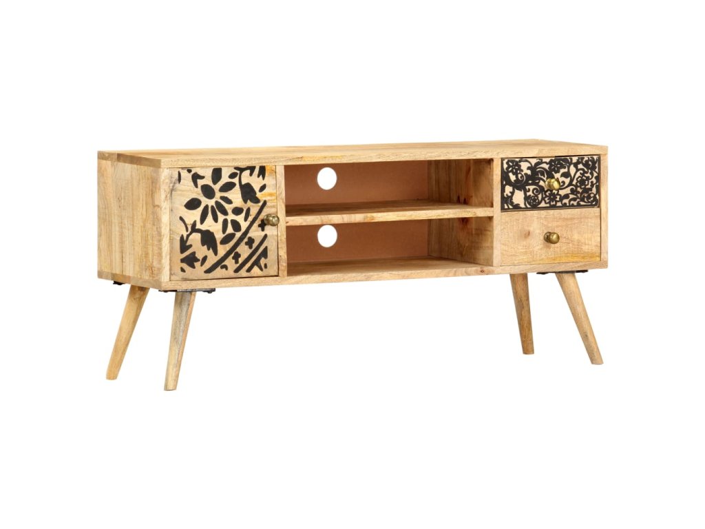 Stolek pod TV je vyrobený z masivního mangovníkového dřeva, které je nejen stabilní a odolné, ale zároveň také krásně vypadá. Zručné zpracování podtrhuje jeho okázalý retro styl. Každá fáze výrobního procesu se provádí s mimořádnou péčí, ať už se jedná o leštění, natírání anebo lakování. Překrásná textura a kresba dřeva spolu s řemeslnou výrobou dává každému kusu nábytku jeho jedinečný a od všech ostatních lehce odlišný vzhled a charakter. Tato TV skříňka je designovaná s 2 otevřenými přihrádkami, 2 zásuvkami a přihrádkou s dvířky, které vám poskytnou spoustu úložného prostoru pro přehledné uložení vašich DVD přehrávačů, herních konzolí, satelitních zařízení a mediálních nosičů.