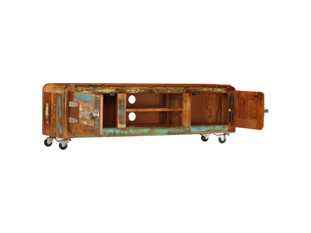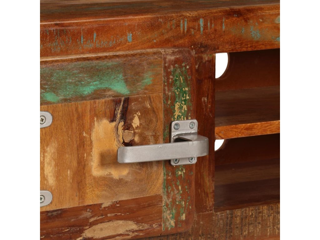 Hi-Fi skříňka je vyrobená z masivního recyklovaného dřeva, které pochází z trámů, podlah a podpěrných nosníků ze starých budov určených k demolici. Sestává tedy z různých druhů dřeva, jako jsou borovice, teak, buk, dub, cedr, mangovník, akácie apod. Recyklované dřevo tak nabývá vlastností všech těchto rozličných typů dřevin. Navíc je již zestárlé, ošlehané a vyschlé, takže se nesmršťuje ani neohýbá. Skříňka je celá ručně vyrobená a esteticky působivá přírodní kresba dřeva ji činí naprosto jedinečnou a lehce odlišnou od ostatních. Kovové prvky dodávají televiznímu stolku industriální nádech. Stolek disponuje 2 skříňkami s dvířky a 2 přihrádkami, jež vám poskytnou spoustu prostoru k uložení vašich multimediálních zařízení, knížek a dalších věcí. Skříňka pod TV je rovněž vybavena 4 kolečky, takže se snadno přesouvá.