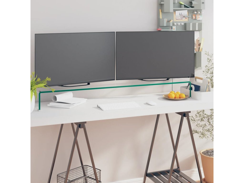 Tuto skleněnou polici můžete použít také jako TV stolek nebo stojan pod monitor vašeho stolního počítače, televizi, notebook nebo jiná multimediální zařízení. Když svůj monitor umístíte na tuto skleněnou polici, budete mít lepší výhled na obrazovku a zároveň se vám bude sedět pohodlněji, což vám pomůže snížit napětí ve vaší šíji a zádech. Úložný prostor pod ní můžete využít pro umístění svého DVD přehrávače, herní konzole, streamovacího zařízení, přijímačů a paměťových nosičů.