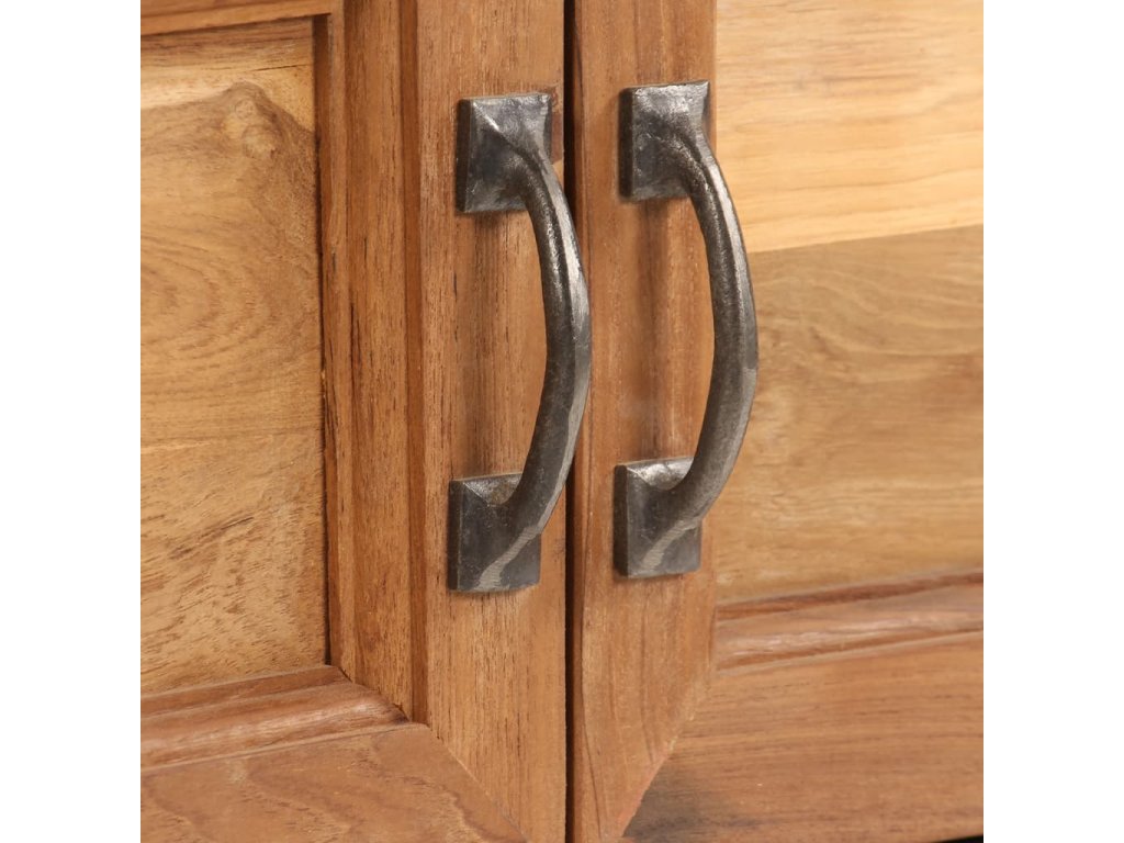 Televizní stolek je vyroben z recyklovaného teaku, který byl vyleštěn a nalakován. Překrásná povrchová úprava mu propůjčuje rafinovaný vzhled. Díky nádherné kresbě dřeva je každý kus nábytku zcela jedinečný a lehce odlišný od ostatních. Tato TV skříňka disponuje pevnou a stabilní deskou, na niž můžete položit svou televizi, košík s ovocem, vázu a jiné dekorativní předměty. Součástí stolku je skříňka a dvě úložné přihrádky, jež vám poskytnou spoustu prostoru k uchovávání vašich multimediálních zařízení, mediálních nosičů a všech ostatních věcí, které byste rádi měli po ruce. Ocelový rám nejen přispívá k odolnosti a stabilitě stolku, ale zvýrazňuje také jeho industriální styl. Předmět je již sestaven; další montáž není nutná.