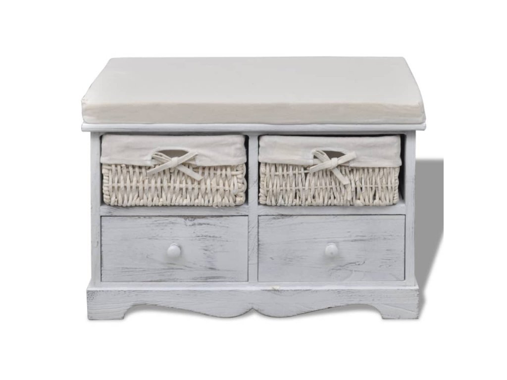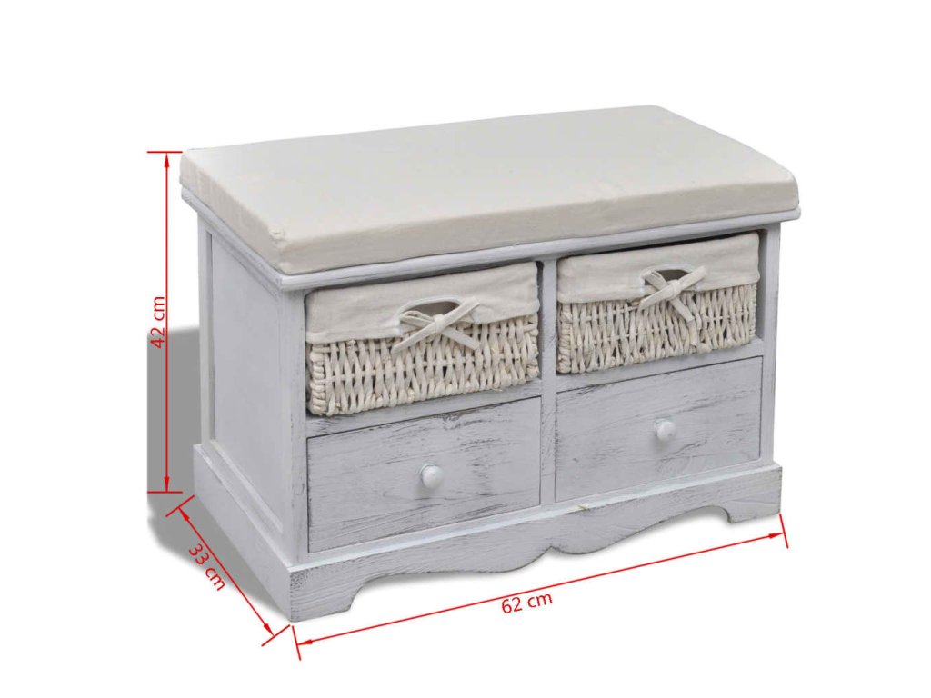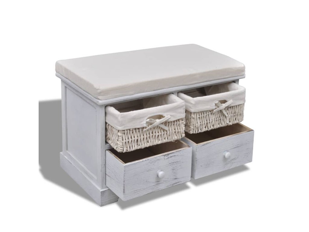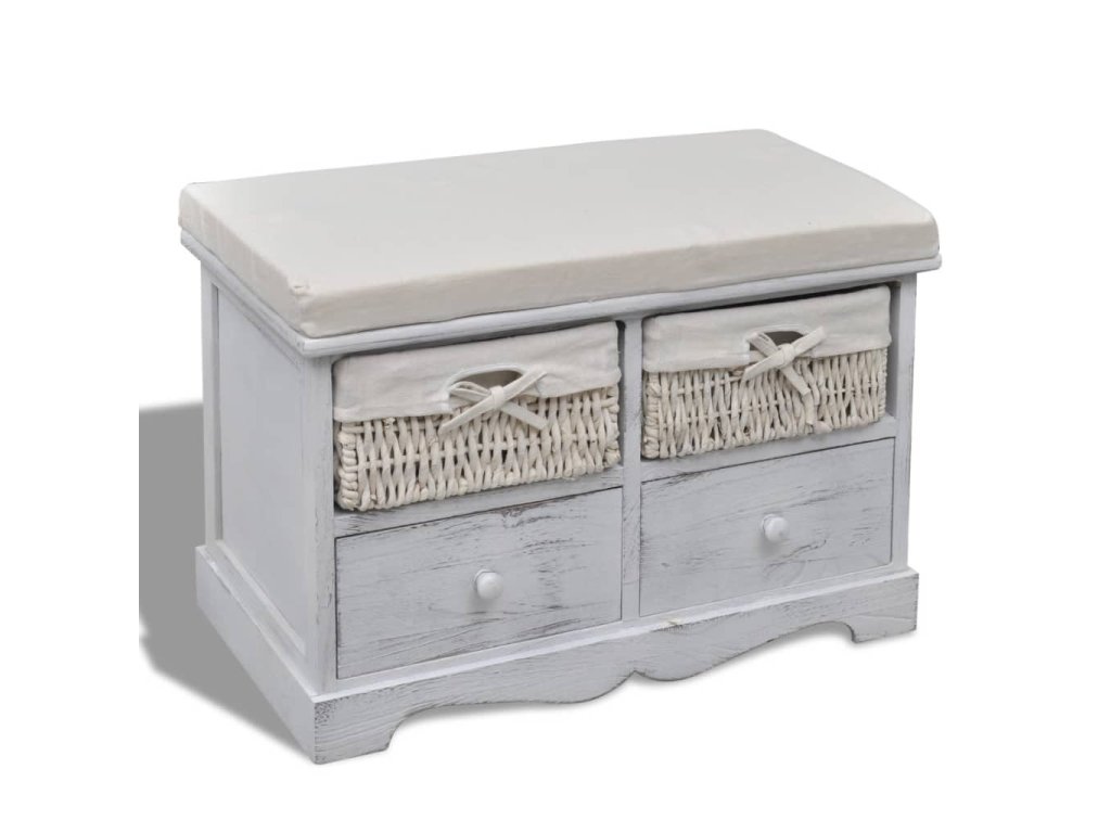 Tato odolná úložná lavice je doplněná dvěma pletenými košíky a dvěma dřevěnými zásuvkami, ve kterých najdete dostatek prostoru pro vaše cennosti. Lavice do vašeho pokoje také přinese milý country styl. Místo k sezení je změkčené poduškou, která nabízí příjemné místo k posezení. Je to perfektní nábytek pro vaši verandu, šatnu, ložnici a mnoho dalších míst.