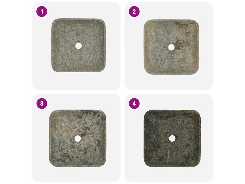 Poznámka: Mramor je přírodní produkt, a proto se v jeho zbarvení mohou vyskytovat drobné rozdíly. Zejména pro šedě zbarvený mramor platí, že skutečný produkt může být světlejší nebo tmavší než na fotografiích a v jeho zbarvení se též mohou vyskytnout kombinace různých barev. Příklad opravdového zbarvení produktu viz poslední obrázek.