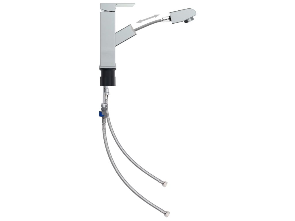 Tento kohoutek do koupelny má masivní mosaznou konstrukci a kovové rukojeti, takže je odolný a robustní. Kohoutek má také praktickou flexibilní nerezovou připojovací hadici, takže je vhodný pro většinu umyvadel a snadno ho připojíte ke všem běžným systémům tlakových ohřívačů se studenou a teplou vodou. Vodovodní baterie má také vytahovací spršku z ABS a praktické otočné ramínko s 360stupňovým rozsahem otáčení.