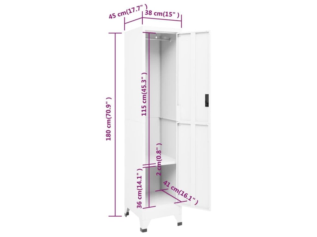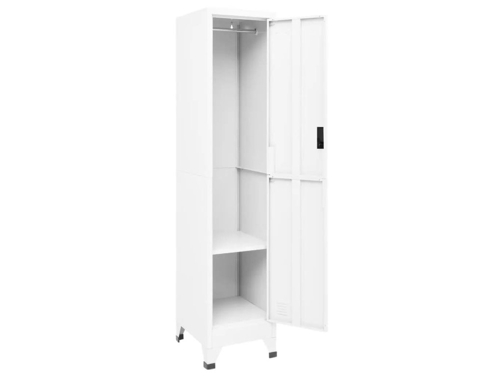 Úložná skříňka je vyrobena z oceli, proto má dlouhou životnost a snadno se čistí. Skříňka je vybavená věšákem, policí a uzamykatelnými dvířky s větracími otvory. Skříň má dostatek úložného prostoru pro bezpečné uložení oblečení a dalších osobních věcí. Držáky na štítky a větrací otvory umožňují přehledně třídit vaše položky. Tato skříň je vhodná do škol a kanceláří k uložení různých věcí.