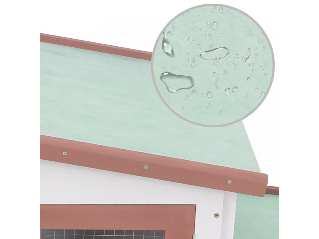 Je postavená z natíraného masivního jedlového dřeva, které je pro zvířata bezpečné a má dlouhou životnost. Asfaltová střecha chrání vaše chlupaté přátele před nepřízní počasí. Zvýšené okraje udrží vaše malá zvířata v bezpečí, suchu a teple, zejména za deštivých dnů. Obě strany jsou vybavené rampou, takže váš mazlíček může snadno vyšplhat do pelíšku. Kotec je navržený pro nenáročnou údržbu a má odnímatelné dno pro jednodušší čištění. Výběh s odolným oplocením zajišťuje dostatečnou ventilaci a brání domácím mazlíčkům ve výletech ven, zatímco dravce naopak nepustí dovnitř. Uzamykatelná dvířka chrání vaše mazlíčky a umožňují bezproblémový přístup.