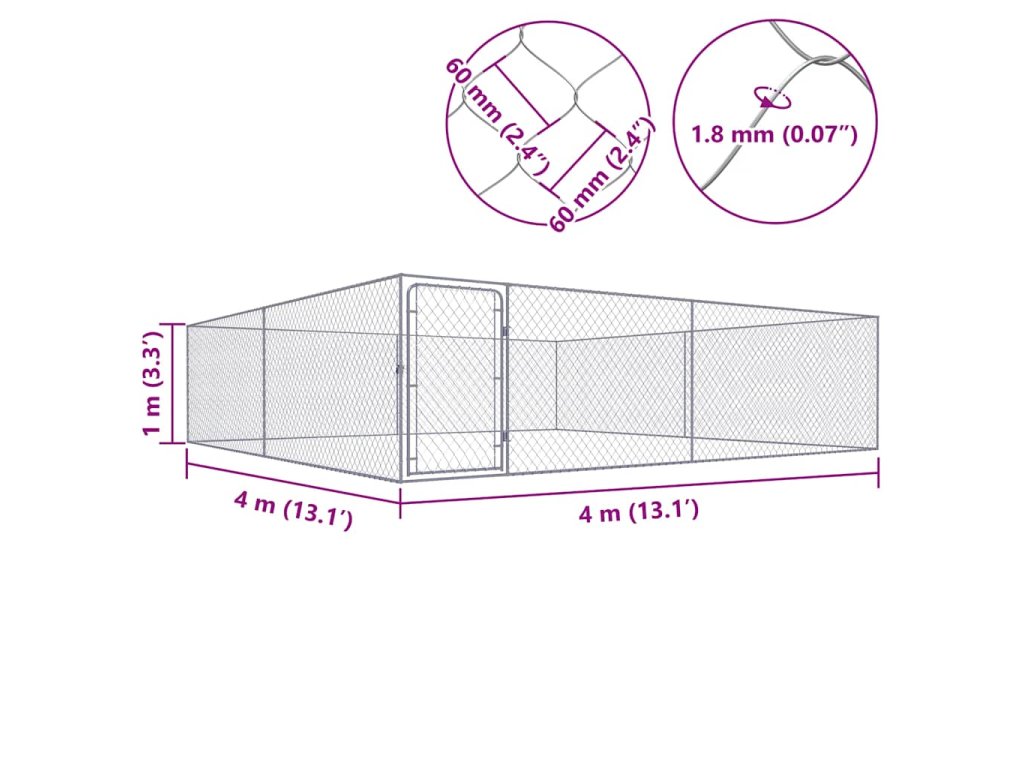 Ohrádka je vyrobena z pozinkované oceli, která je odolná a vhodná pro venkovní použití. Řetězové bočnice na stěnách pomáhají předcházet neštěstím a neočekávaným nehodám a zároveň umožňují dobrou ventilaci. Ohrádka pro psy je vybavena závěsnými dvířky a zamykacím systémem pro větší bezpečnost a zabezpečení vašich psů. Psí kotec sestavíte snadno a rychle.