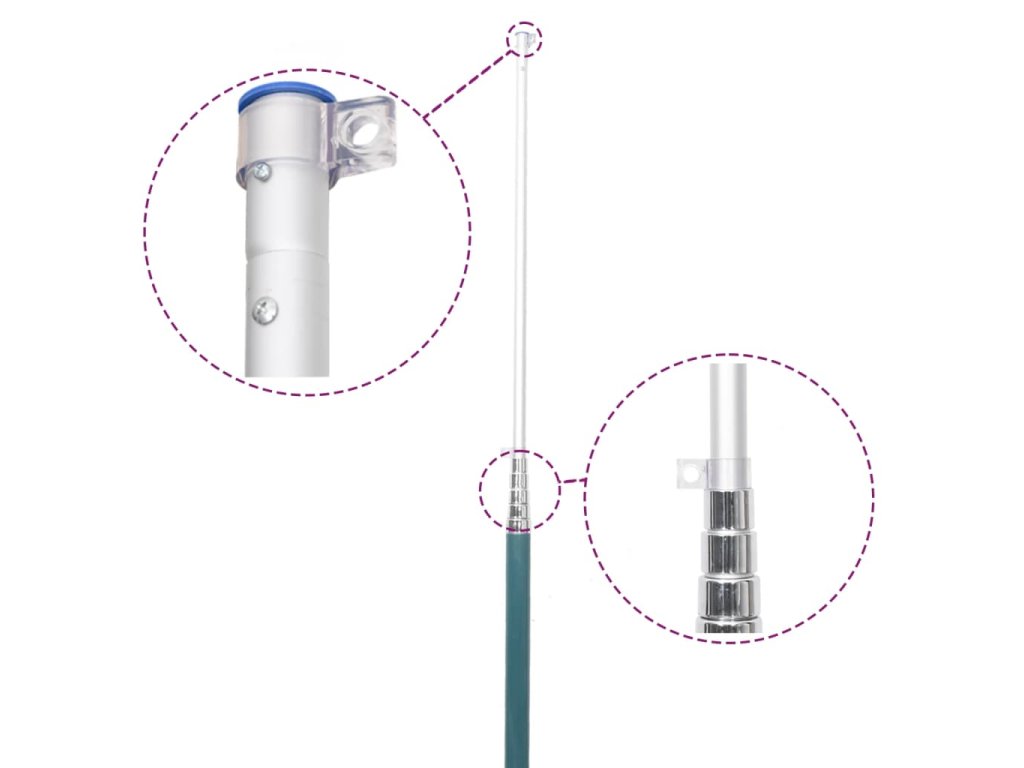 - Snadné ovládání: Vzhledem k jednoduchému zásuvnému systému lze stožár postavit během chvilky. Pomocí přiloženého lana a kroužků můžete vlajku bez problémů posouvat nahoru a dolů.