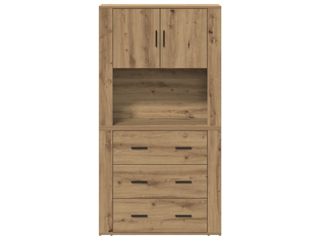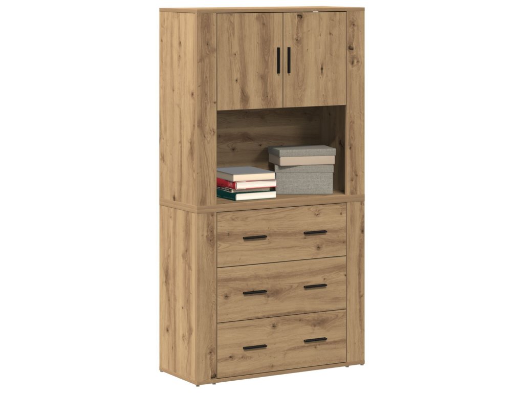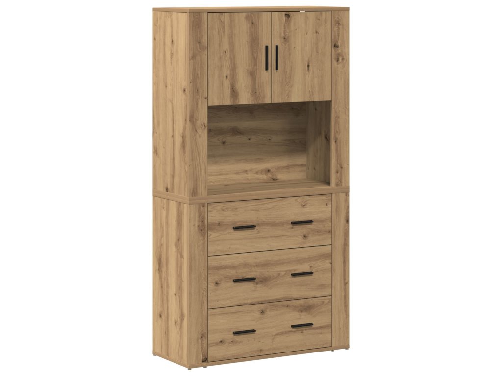 Moderní styling: Tato skříň spojuje styl a funkčnost, čímž vylepšuje váš domov elegantním designem. Je ideální do jídelny nebo obývacího pokoje, protože dodává prostoru jemnou eleganci a šmrnc. S minimem ozdob její čistý design zajišťuje nadčasovou přitažlivost. Řemeslná výroba z inženýrského dřeva: Vyrobená z odolného inženýrského dřeva, skříň zaručuje dlouhou životnost. Robustní rám udrží všechny vaše věci, takže nábytek vydrží dlouho a přitom si uchovává hezký vzhled. Efektivní úložné řešení: Díky policím a zásuvkám z inženýrského dřeva je skříň praktická a umožňuje krátit nepořádek. Dveře na pantech usnadňují přístup k ukládaným věcem a design zajišťuje úhledné uspořádání. Funkční komponentní design: Kovové úchyty jsou moderní a umožňují snadné otevírání dveří a zásuvek. Inženýrské dřevo zajišťuje pevnost a nosnost skříně, což přináší kombinaci stylu a praktického využití. Snadná montáž: Skříň se snadno sestavuje, stačí mít dva lidi a šroubovák. Poté budete mít spolehlivý a stylový kus nábytku připravený k použití.- Barva: Artisanový dub