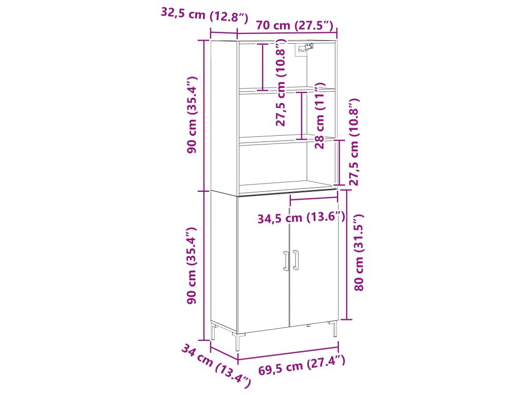 - 1 x vrchní část pro vysokou skříň: 69.5 x 34 x 90 cm (D x Š x V)