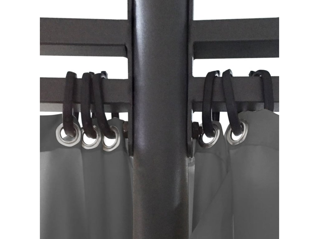 Tento zahradní stan je vyrobený z vysoce kvalitního polyesteru, který odpuzuje vodu a špínu a je odolný vůči UV záření. Díky svému pevnému ocelovému rámu s práškovým nástřikem je tento altán robustní a velmi odolný. Má dvojitou střechu s ventilačními otvory, které umožňují lepší proudění vzduchu. Snadno čistitelné polyesterové závěsy s vazačkami se dají zatáhnout pro zvýšené soukromí.