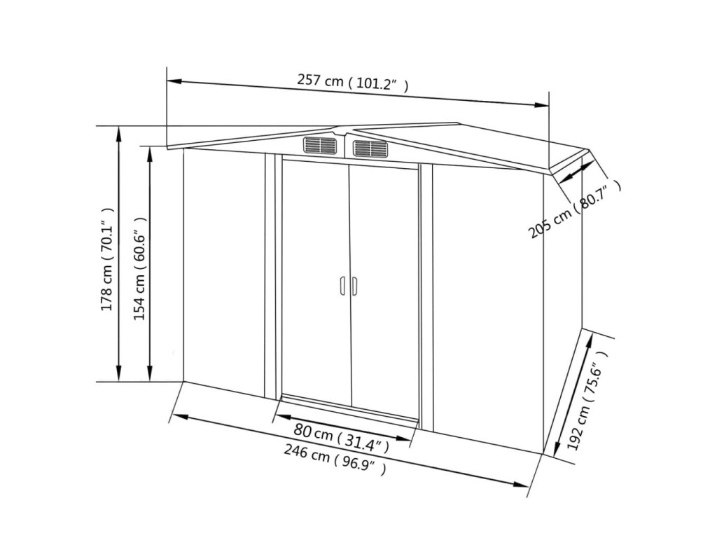 Tento zahradní domek na nářadí má 4 větrací otvory, 2 vepředu a 2 vzadu, které zajišťují vynikající cirkulaci vzduchu. Dvoukřídlé posuvné dveře v čelní stěně umožňují snadné vcházení a vycházení.