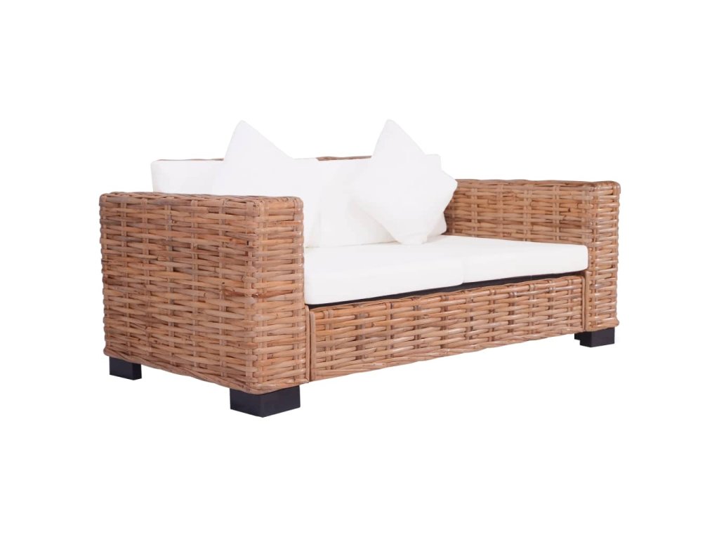 Sedačka je vyrobená z přírodního ratanu, snadno se čistí, je odolná vůči opotřebení a dokonale se hodí na venkovní použití. Disponuje pevným, stabilním dřevěným rámem a pohodlnými, tlustými poduškami a polštáři za záda. Podušky mají snímatelné potahy, takže je můžete vyprat. Pohovka má také široké područky pro zvýšené pohodlí. Jelikož je zhotovená z přírodního ratanu, je vhodné pohovku chránit proti klimatickým vlivům.