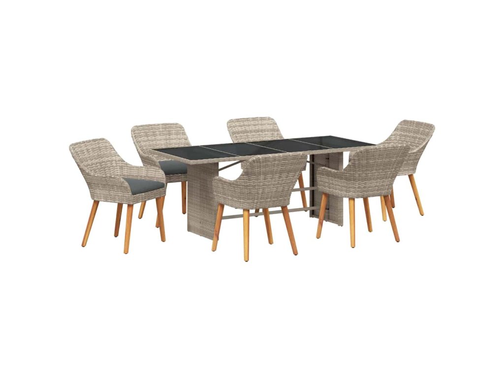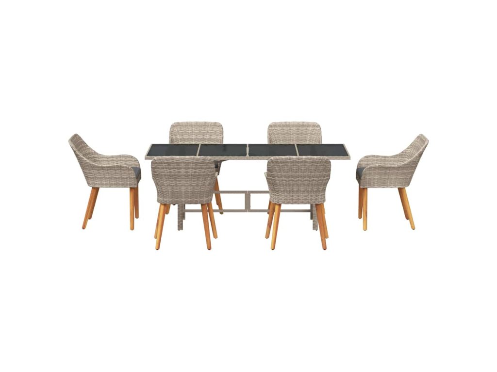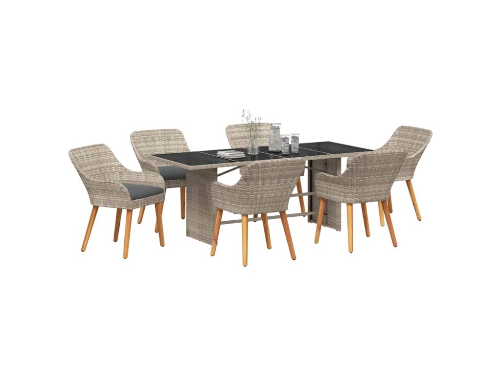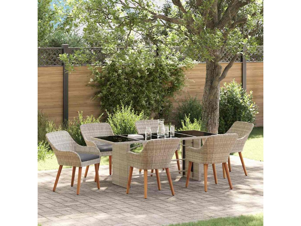Tento moderní venkovní jídelní set splňuje všechny požadavky na styl, funkčnost a odolnost, takže je super volbou pro každou zahradu, terasu nebo balkon. Nabízí dostatek místa pro hosty, ideální na venkovní večeře nebo rodinná setkání. S hezkým tkaným vzhledem a odolnou konstrukcí proti počasí dodá moderní vibe každému venkovnímu prostoru. Je vyrobený z poly ratanu, tvrzeného skla a práškově lakované oceli, a je navržený na dlouhou životnost, takže vypadá skvěle za každého počasí.
