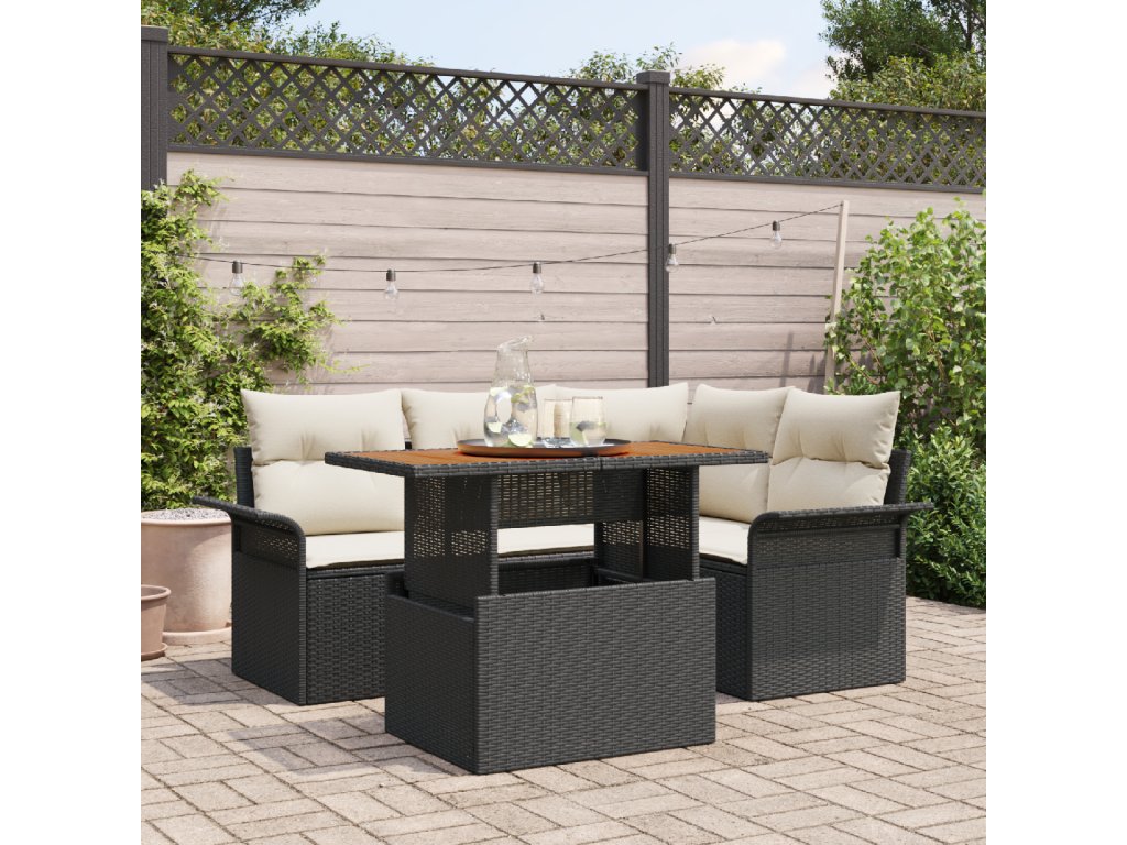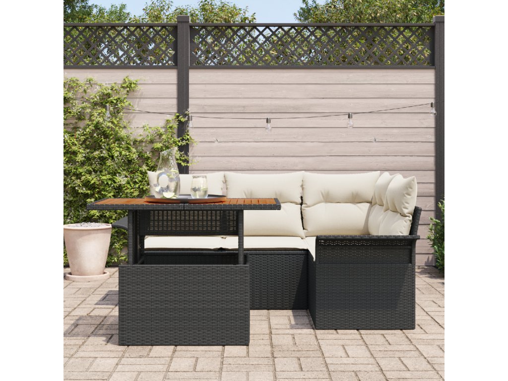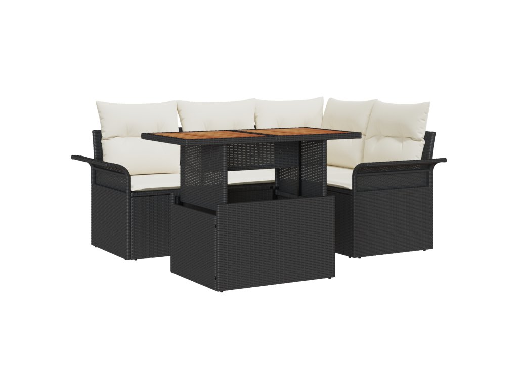Materiály a konstrukce: Vyrobena z odolného polyratanu, tato zahradní sedací souprava zajišťuje dlouhou životnost a skvělý vizuální dojem. Práškově lakovaná ocelová konstrukce poskytuje spolehlivou oporu, zatímco pevný akáciový dřevěný povrch nabízí přirozeně živý vzhled. Tyto materiály jsou pečlivě vybírány, aby zajistily maximální stabilitu, odolnost vůči počasí a atraktivní estetiku. Praktická úložná řešení: Tato souprava obsahuje integrovaný úložný prostor v opěrných sedacích sofa, rozích a středních sedácích, čímž maximalizuje funkčnost a prostorovou organizaci. Skryté přihrádky jsou perfektní pro ukládání polštářů, dek nebo dalších nezbytností, udržujících váš venkovní prostor uklizený a přívětivý, aniž by to ohrozilo design. Nezkompromisní pohodlí: Souprava zahrnuje měkké venkovní polštáře, které jsou úplně odnímatelné, což usnadňuje čištění a údržbu. Navrženo s ohledem na pohodlí, tyto polštáře poskytují uvolněný zážitek ze sezení a přispívají k celkové eleganci a užitečnosti při vytváření příjemné venkovní atmosféry. Stylové opěrky: Jemně zakřivené a vyrobené z odpovídajícího polyratanu, opěrky rukou spojují design s pohodlím uživatele. Ideální pro opření nebo odpočinek, tyto opěrky doplňují celkový design, harmonicky se mísí s plnou kompozicí sofa. Jejich design podporuje prodloužené sezení, ať už se scházíte s přáteli nebo odpočíváte sami. Údržba a péče: Zajišťujte trvalou krásu tím, že pokryjete tento nábytek během mimo sezóny nebo nepříznivého počasí a otírejte ho vlhkým hadříkem pro rutinní čistotu. Taková praxe pomáhá zachovat jeho vzhled a funkčnost, což z něj činí trvalou investici pro každého nadšence do zahrady.- Barva: Černá a krémová