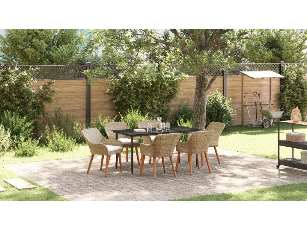 Tato zahradní jídelní sada dává šikovný a pohodlný prostor pro jídlo venku, ideální pro setkání s kámošema nebo rodinou. Je navržená se současným stylem, takže vaší zahradě nebo terase dodá super vzhled, a vytváří příjemný prostor pro venkovní jídlo, když je krásně. Vyrobena z odolného poly ratanu, skvěle se hodí jak do jednoduchých, tak luxusních zahrad.