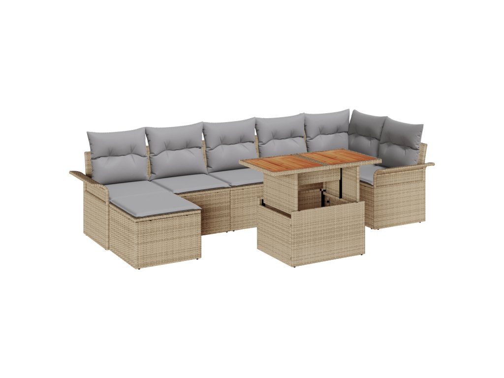 Prémiové materiály: Vyrobeno z polyratanu a masivního akáciového dřeva. Polyratan je odolný vůči UV záření a počasí, ideální pro venkovní používání. Akáciové dřevo přidává na odolnosti a teple designu. Kompletní sestava: Sada obsahuje dva arm pohovky, rohové sedadlo, tři středové sedáky, taburet a zahradní stůl – dost místa pro všechny. Každý kus má zaoblené hrany, takže se hodí do každé uspořádání. Materiály pro opření zajišťují pohodlí s rodinou nebo přáteli. Funkční stůl: Nastavitelný stůl se snadno mění z kávového na jídelní. Ideální pro ty, kdo ocení flexibilitu a využití prostoru. Vhodné použití: Perfektní na terasy, zahrady a dvorky, tato sada vytváří stylové prostředí pro venkovní stolování nebo relaxaci. Modulární design usnadňuje přemisťování a přizpůsobení na různé akce. Údržba: Chraňte nábytek krytem, když ho nepoužíváte. Pravidelně udržujte, aby zůstal v dobrém stavu a sloužil vám další sezóny.- Barva: Béžová a světle šedá