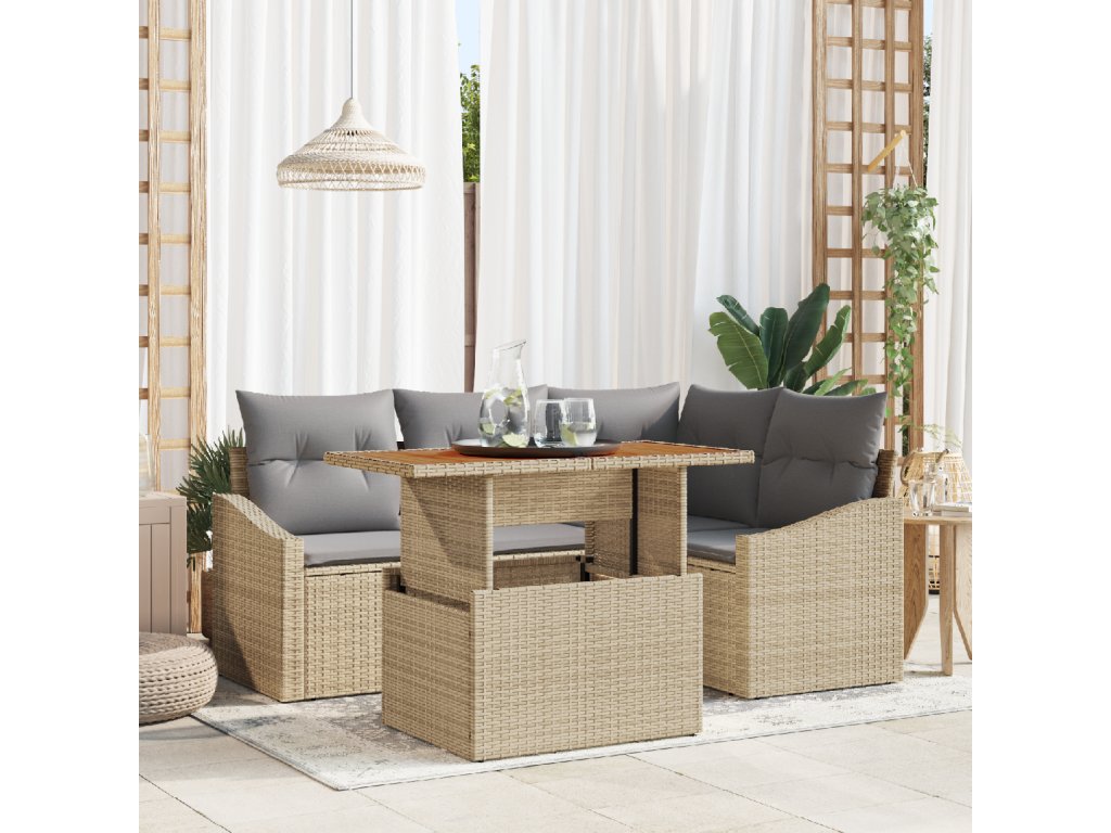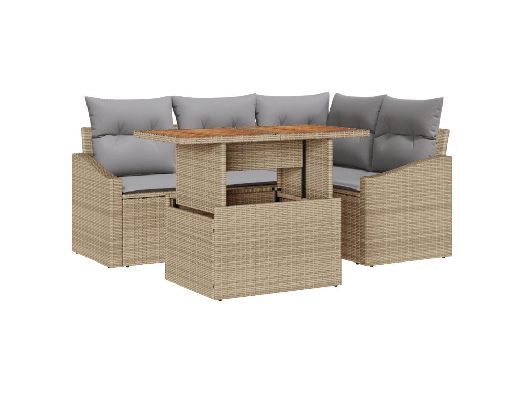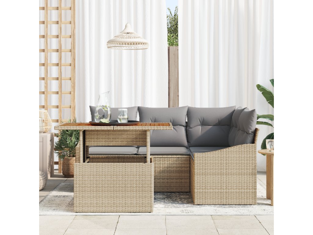 Odolné materiály: Poly ratan a práškově lakované ocelové komponenty zajišťují, že je set odolný vůči různým povětrnostním podmínkám, nabízí UV ochranu a trvanlivost pro dlouhodobé venkovní použití. Stabilní akáciové dřevěné povrchy dodávají přírodní krásu a robustní podporu, udržují atraktivní a odolnou přítomnost na vaší terase nebo zahradě. Součásti sedadel: Tento set zahrnuje dvě arm pohovky a jeden rohový a středový sedák, všechny s integrovaným úložným prostorem. Dokončený a přitažlivý zadní strana umožňuje univerzální umístění, zatímco měkké polyesterové polštáře zabezpečené zipy zaručují pohodlí a snadnou údržbu. Modulární funkce: Přizpůsobte si uspořádání sedadel snadno pomocí modulárních a nastavitelných komponentů setu, které jsou ideální pro přizpůsobení osebným potřebám. S nastavitelnými nožičkami zajistěte stabilitu na nerovných venkovních terénech, čímž zvýšíte jak funkčnost, tak pohodlí pro různá uspořádání sedadel. Doporučené použití: Tento zahradní jídelní set je navržen pro venkovní použití, což z něj činí stylový doplněk pro terasy, zahrady nebo zahrady. Jeho sofistikovaný design a praktické funkce poskytují flexibilitu pro různé příležitosti, od intimních alfresco večeří po živé letní večírky. Komplexní péče: Chcete-li zachovat krásu a dlouhověkost vašeho nábytku, ukládejte polštáře do interiéru během nepříznivého počasí a chraňte set voděodolným krytem, když se nepoužívá. Tyto jednoduché údržbové kroky zvyšují trvanlivost a vzhled pro dlouhodobé potěšení.- Barva: Beige a šedá