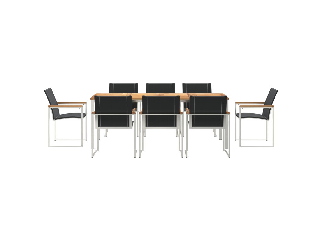 Tento moderní venkovní jídelní set je super přírůstek do každé zahrady nebo na terasu, ideální pro rodinné večeře nebo víkendové brunch. Jeho elegantní design s čistými liniemi a minimum zbytečností skvěle ladí s jakýmkoli venkovním prostorem. Vydrží venku a vypadá stylově.