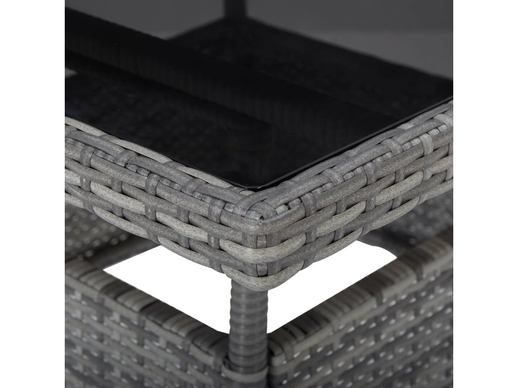 Vychutnejte si s naším jídelním stolem večeři pod hvězdami nebo prosluněný oběd na terase. Pohodlně se k němu usadí až 4 osoby. Stůl z polyratanu, zpevněném rámem z oceli s práškovým nástřikem, je odolný vůči UV záření i dalším klimatickým vlivům a zaručuje roky spokojeného používání ve venkovním prostředí. Stolní deska z vyztuženého tvrzeného skla je velmi pevná a snadno se udržuje a čistí. Lehká ratanová konstrukce usnadňuje přesouvání a přenášení stolu.