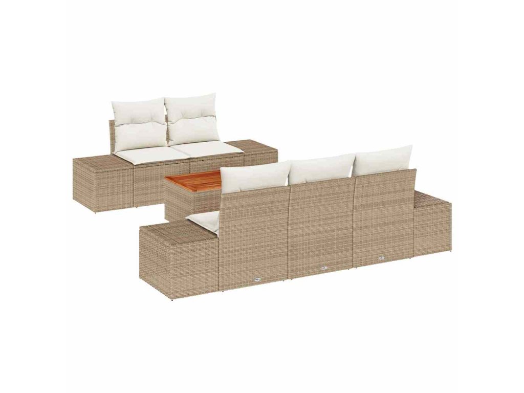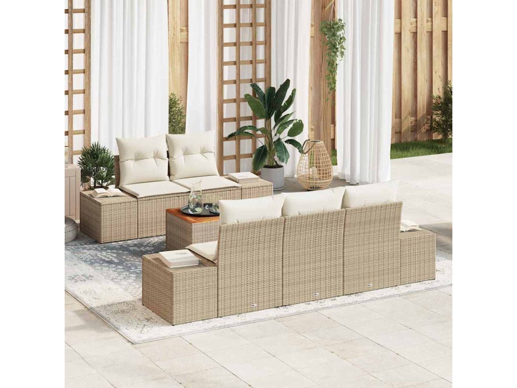 Materiály: Sedací souprava je vyrobena z odolných materiálů, včetně poly ratanu tkaného kolem práškově lakovaného ocelového rámu a doplněného o celistvé akáciové dřevo. Tyto materiály zajišťují stabilitu a dlouhou životnost, čímž jsou ideální pro venkovní rekreaci. UV-odolné vlastnosti chrání před tvrdým slunečním zářením, udržují soupravu vypadat prvotřídně i po čase.,Součásti: Tato souprava zahrnuje více kusů: hlavní centrální sedadlo s úložným prostorem, více pohovek a zahradní stůl, každý vybaven voděodolnými úložnými taškami. Tyto komponenty jsou navrženy tak, aby zvýšily funkčnost a zajistily harmonické propojení s přírodou při maximalizaci prostorové efektivity.,Funkce / Design: S modulární konstrukcí poskytuje souprava všestrannost v uspořádání sezení. Nastavitelné nožičky umožňují uživatelům přizpůsobit výšky pro rovné terasy nebo travnaté plochy, což zajišťuje dodatečný komfort pro prodloužené sezení. Její čisté, moderní linie hladce zapadají do různých designových estetik.,Odporučené použití: Ideální pro zahrady, terasy a zahrady, tato souprava uspokojuje sezónní setkání, osamělou relaxaci nebo neformální stolování. Elegantní vzhled a funkční atributy podporují různé nastavení, od jarního brunchu až po letní lenošení.,Péče a údržba: Správná péče prodlužuje životnost tvého nábytku. Chraň ho krytem, když není používán, aby si udržel svěží vzhled. Snadná údržba nabádá k dalšímu užívání této úžasné venkovní sezení.- Barva: Béžovo-bílá