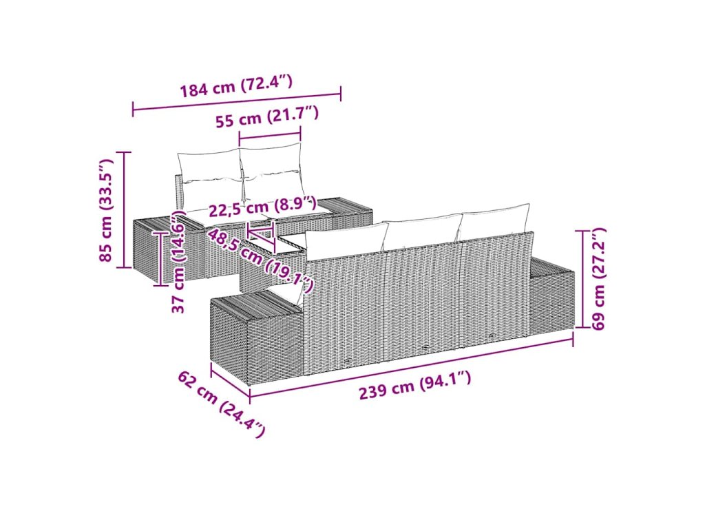 - 4 x Boční pohovka: 184×62×85 cm (Š×H×V)
