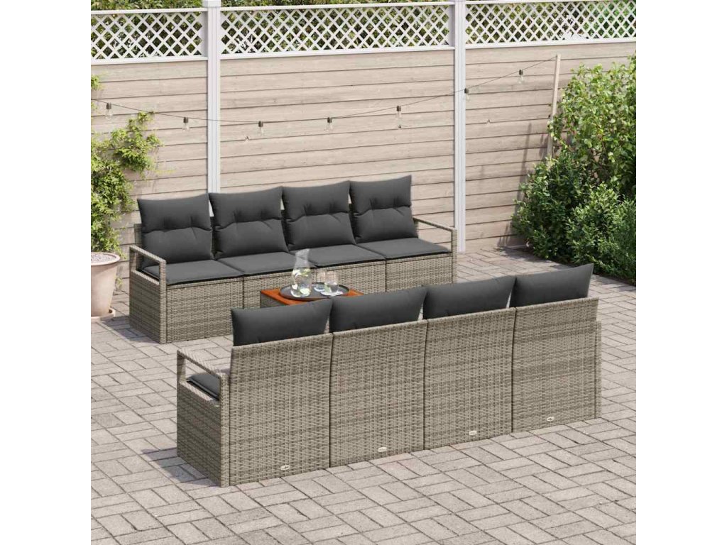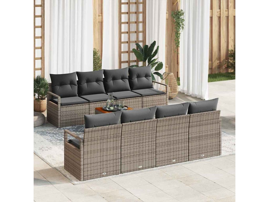 - Odolná Konstrukce: Sedací souprava ukazuje spojení PE ratanu, práškově lakované oceli a masivního akáciového dřeva, zajišťující dlouhotrvající odolnost proti různým venkovním prvkům. Tato kombinace materiálů nejen zvyšuje pevnost, ale také nabízí sofistikovaný šarm, který doplňuje jakoukoli zahradní fasádu.