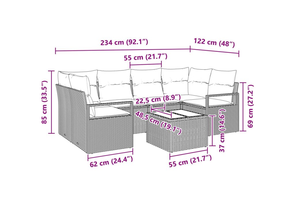 - 2 x Rohové sedadlo: 62x62x85 cm (DxŠxV)