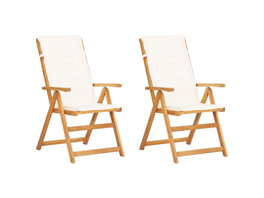 Sada polohovacích židlí je vyrobená z masivního akáciového dřeva, což je tropická tvrdá dřevina, která výborně vzdoruje klimatickým vlivům a má dlouhou životnost. Látkové podušky vám při sezení poskytnou mimořádné pohodlí. Opěradlo židle lze naklopit do 5 různých poloh, aby se vám vždy podařilo najít tu nejpříjemnější pozici. Vzhledem k jejich lehkému designu se židle dají bez námahy přesouvat po celém domě. A když je právě nepotřebujete, můžete je složit, abyste ušetřili místo.