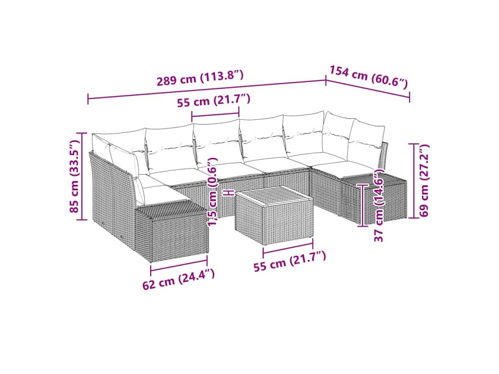 - Součásti: Tento sofa set se dodává kompletní s třemi středními sedadly, dvěma rohovými sedadly, dvěma sofa a zahradním stolem. Každá součást obsahuje voděodolný vak pro ochranu před vlhkostí, což udržuje jejich stav po celý rok. Promyšlené zahrnutí modulárních kusů umožňuje kreativní uspořádání, pokrývající různorodé potřeby sezení.