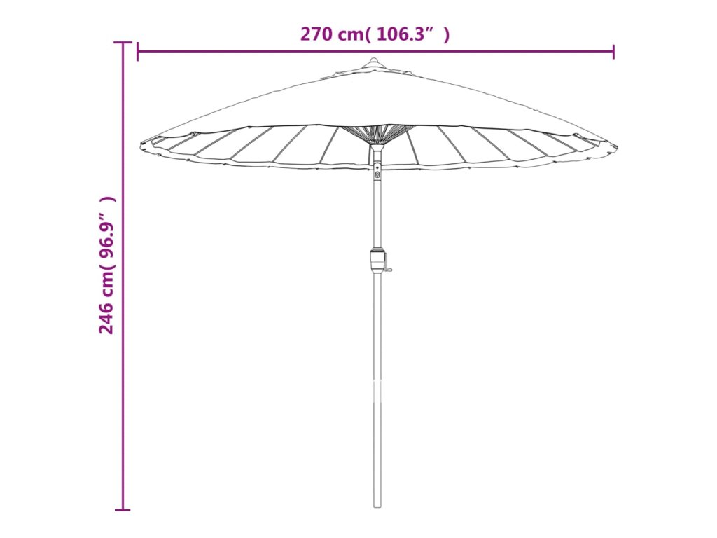 Stříška slunečníku je vyrobená z polyesterové tkaniny, která nebledne a nepropouští škodlivé UV záření, takže vám poskytne optimální ochranu před sluncem. Silná hliníková tyč s 24 odolnými žebry přispívá k výtečné stabilitě produktu a prodlužuje jeho životnost. Zahradní slunečník je vybavený klikovým mechanismem, jehož prostřednictvím ho lze snadno otevírat i zavírat. Sestavení výrobku je jednoduché.
