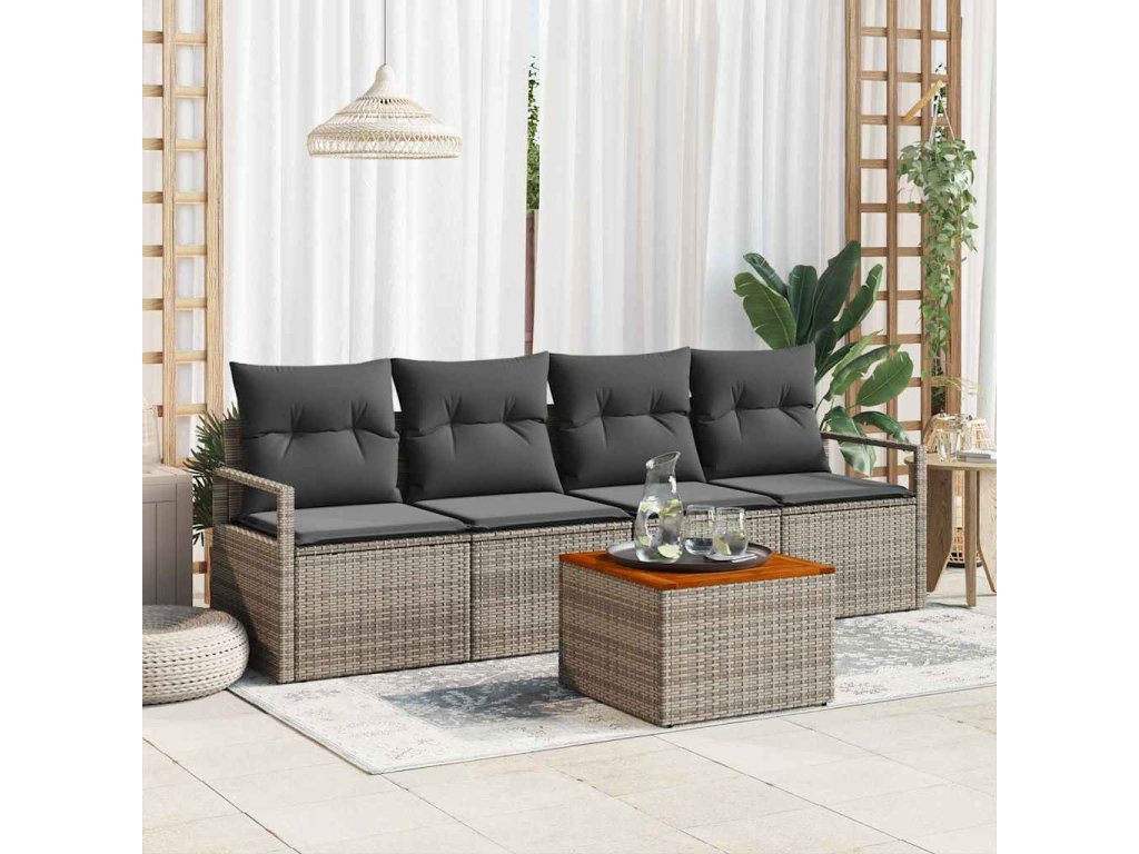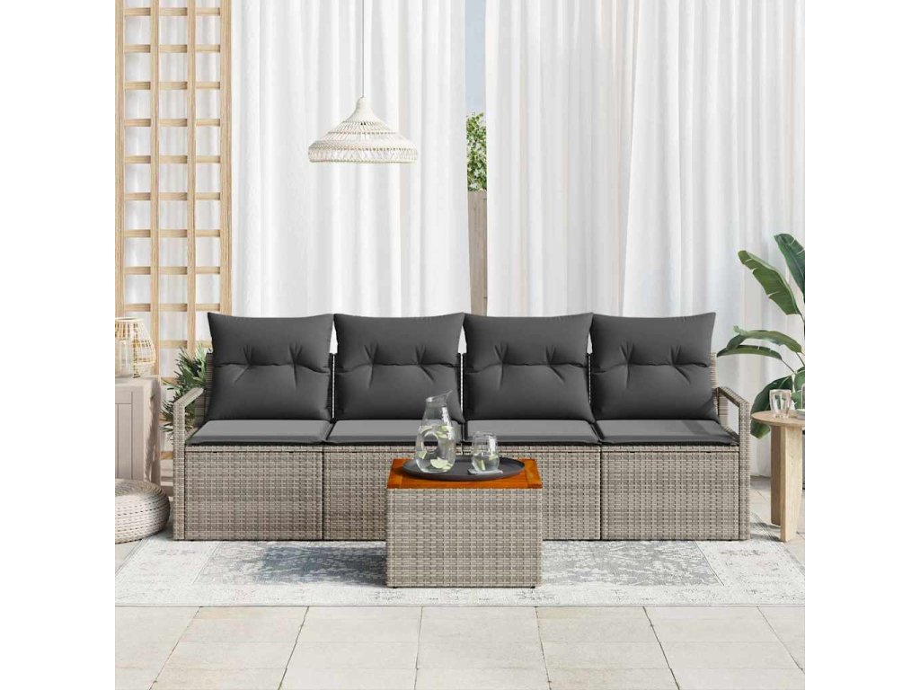 - Materiály: Vyrobeno z prémiového poly ratanového materiálu, práškově lakované oceli a masivního dřeva akácie, tato souprava gauče spojuje eleganci s odolností. Poly ratan zajišťuje odolnost vůči UV paprskům, což zaručuje dlouhotrvající živý vzhled. Práškově lakovaný ocelový rám poskytuje pevnost, zatímco povrch z akáciového dřeva dodává teplý a lákavý dotyk, který se bez námahy prolíná s jakýmkoli přírodním prostředím.