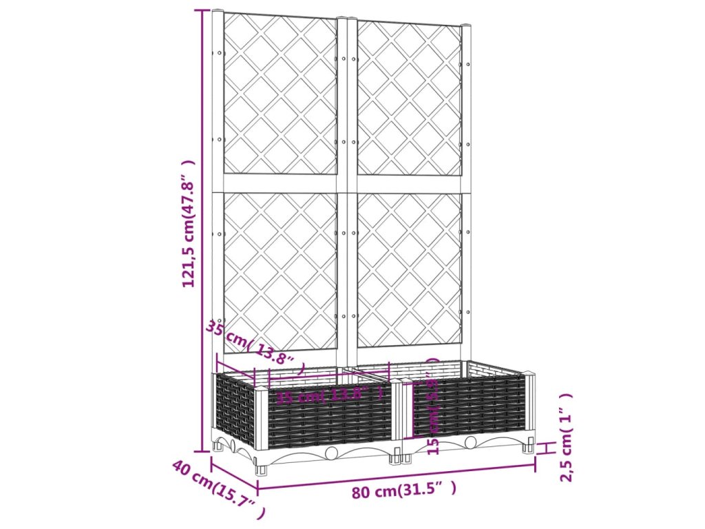 Truhlík je vyrobený z klimaticky odolného PP, je tedy pevný, robustní a vhodný pro venkovní použití. Do spodního květináče se vejde spousta zelených rostlin a květin. Vestavěná treláž zase nabízí oporu pro růst popínavých rostlin, jako jsou rajčata, hrášek nebo růže.